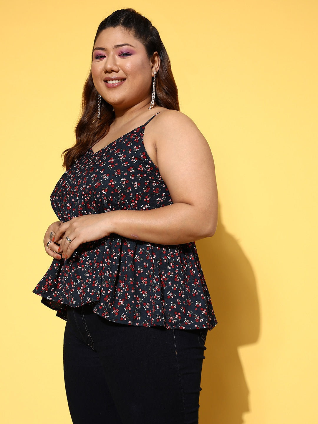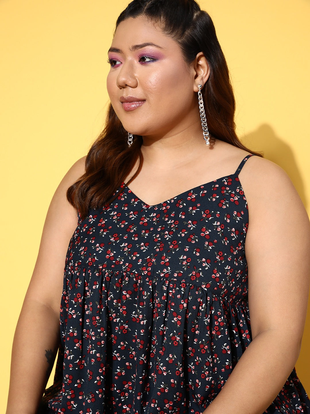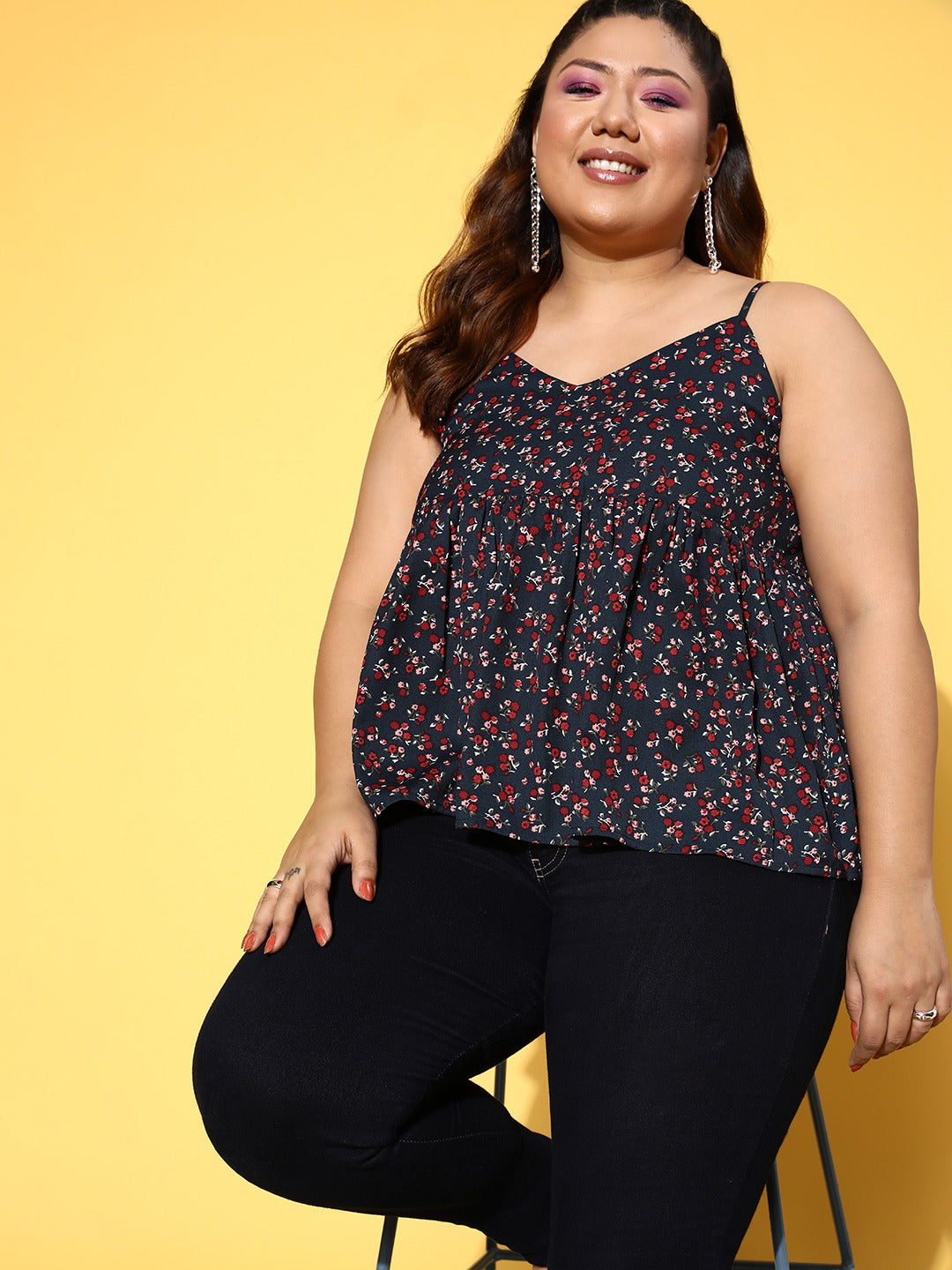 Berrylush Women Plus Size Navy Blue & Red Floral Printed V-Neck Sleeveless Crepe Pleated Empire Top