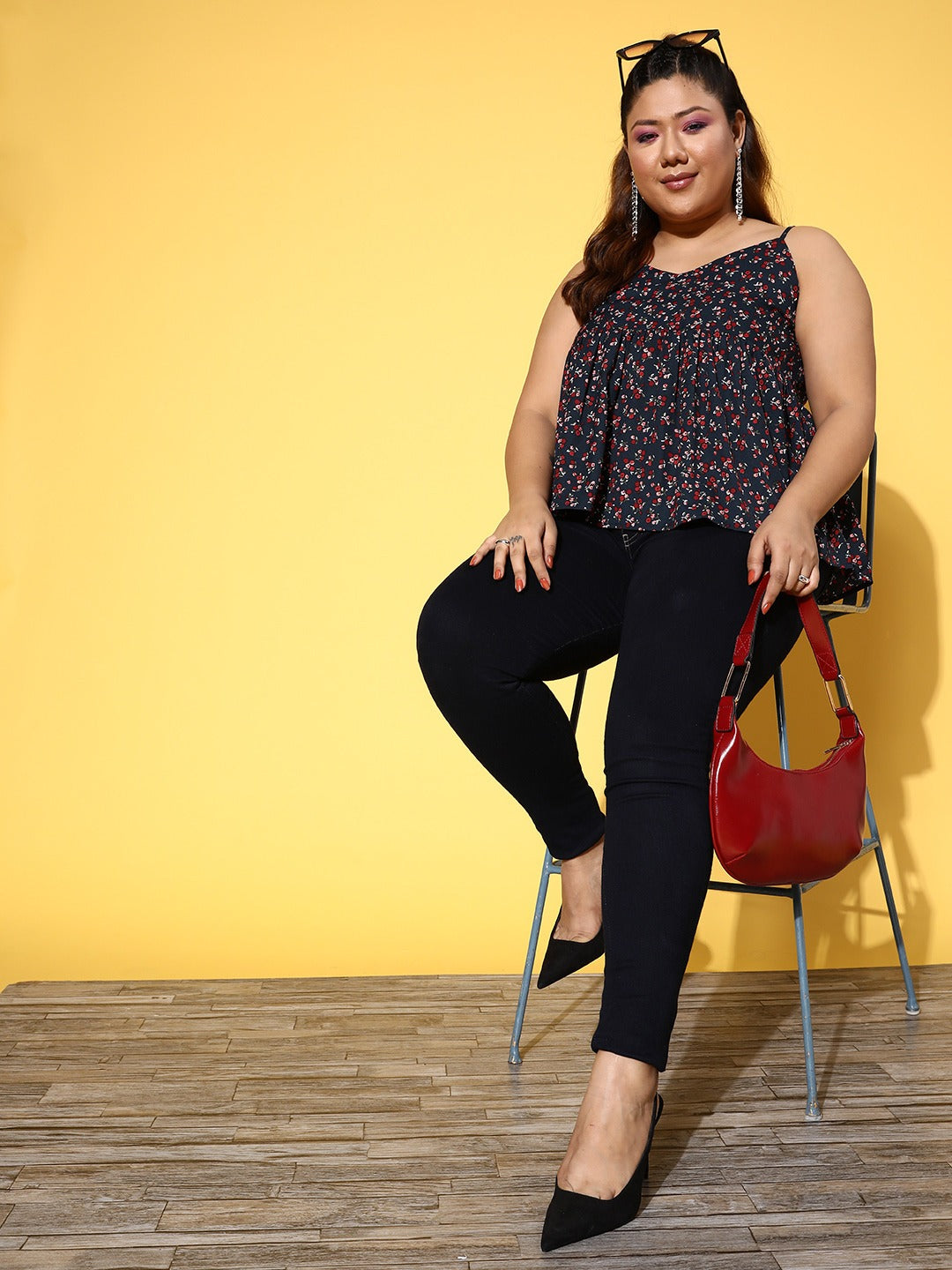 Give your casual closet a stylish makeover with this charming Navy Blue & Red Floral Printed V-Neck Sleeveless Crepe Pleated Empire Top designed by Berrylush. Fashioned with adjustable shoulder straps provide this top a supportive structure with a convenient silhouette. Presenting a beautiful duo of navy blue and red floral print that put together a captivating design giving away a royal vibe. The regular length makes this top appear modish with full coverage of your upper body. You can wear this empire top with pair of black jeans, classy earrings, and a cute handbag to get a fashionable look.