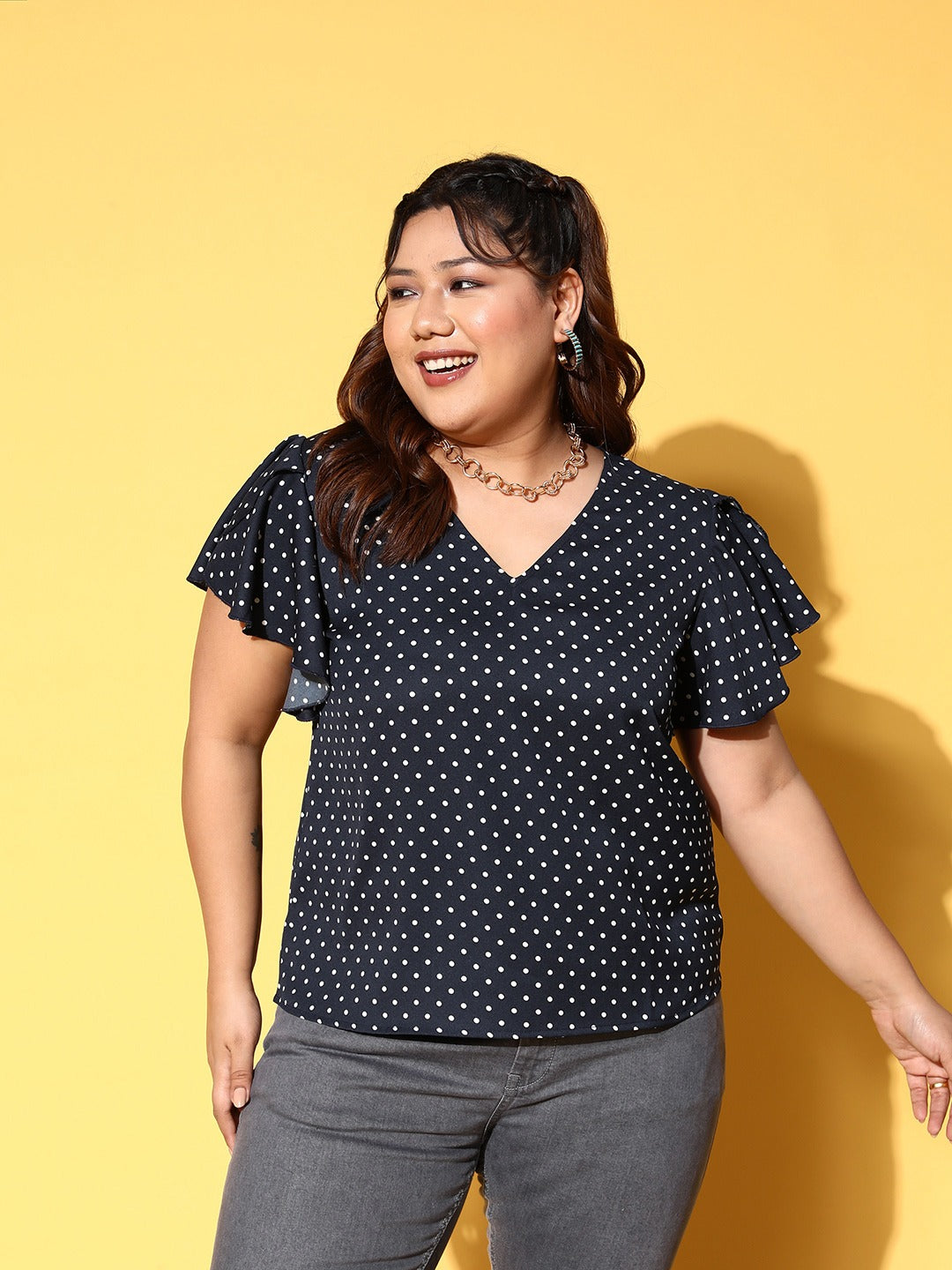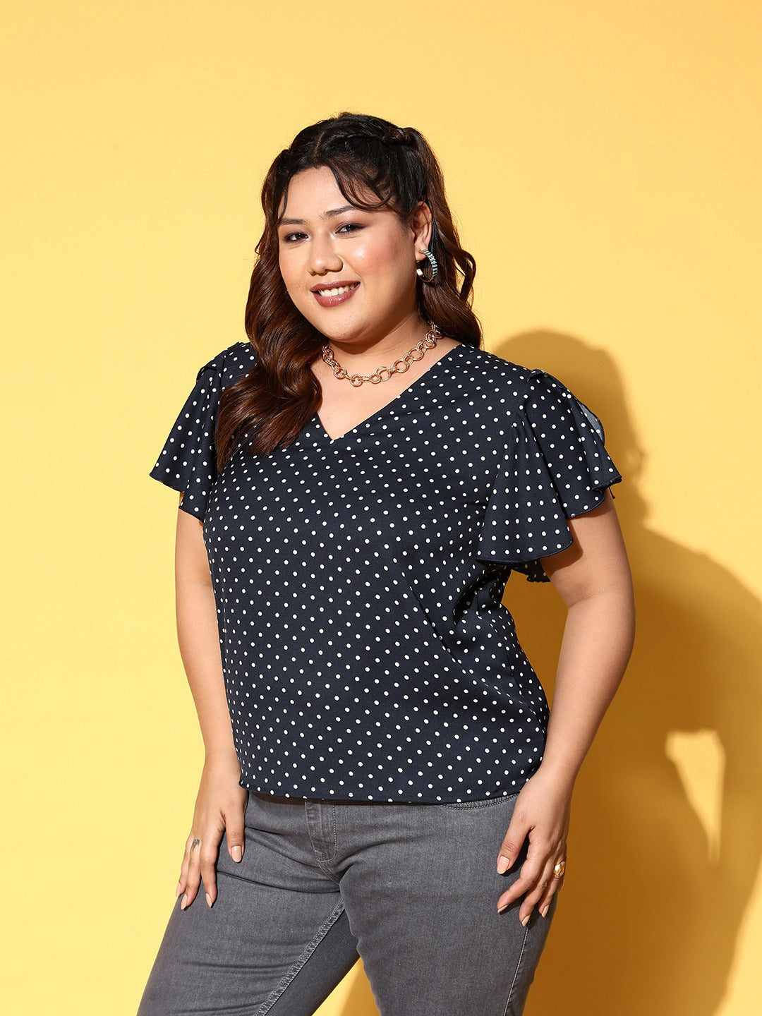 Berrylush Women Plus Size Navy Blue & White Polka Dot Printed V-Neck Flutter Sleeve Crepe Regular Top