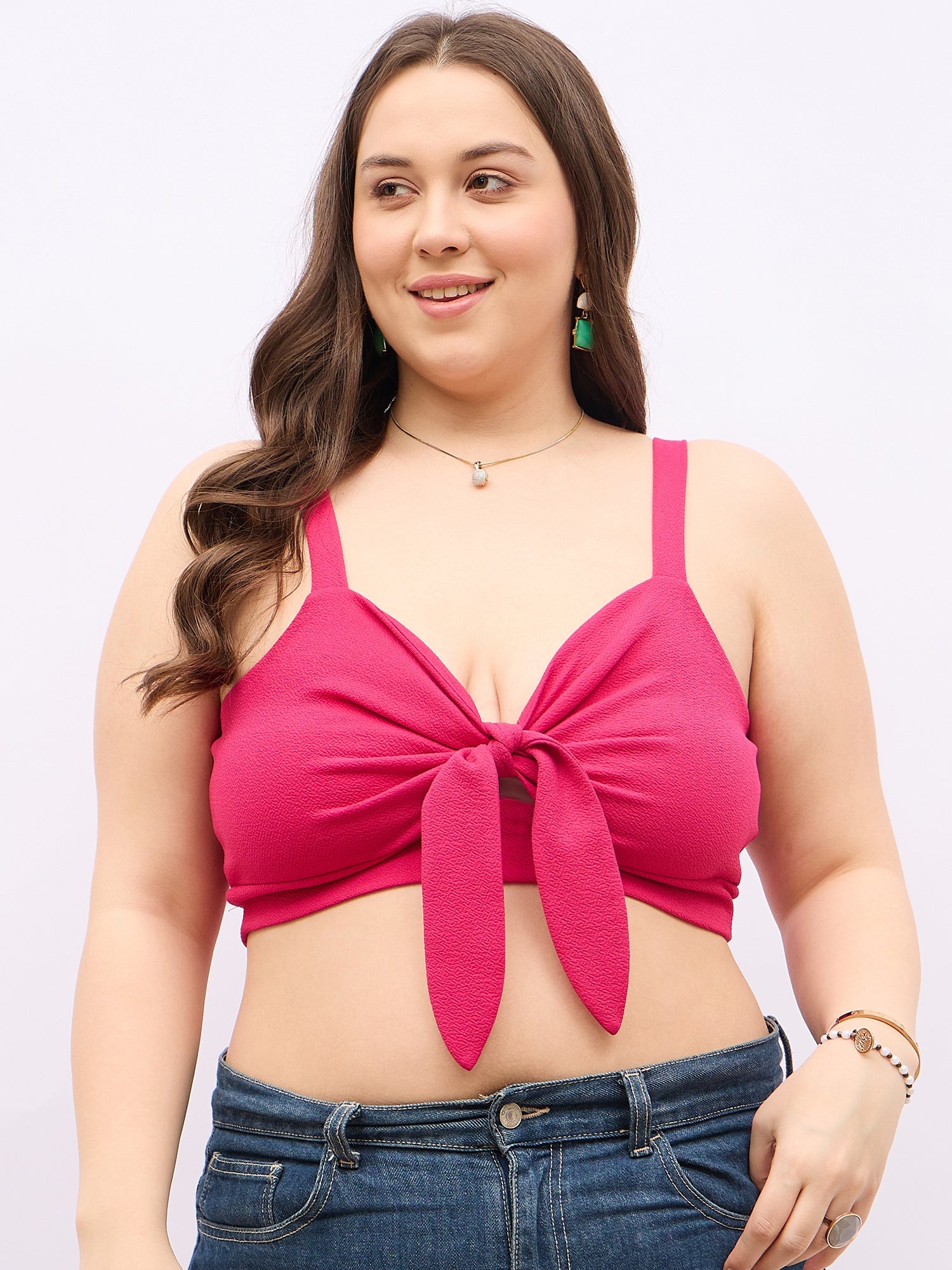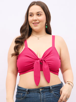 Berrylush Curve Women Solid Pink Tie-Up Neck Sleeveless Front Twisted Crop Top