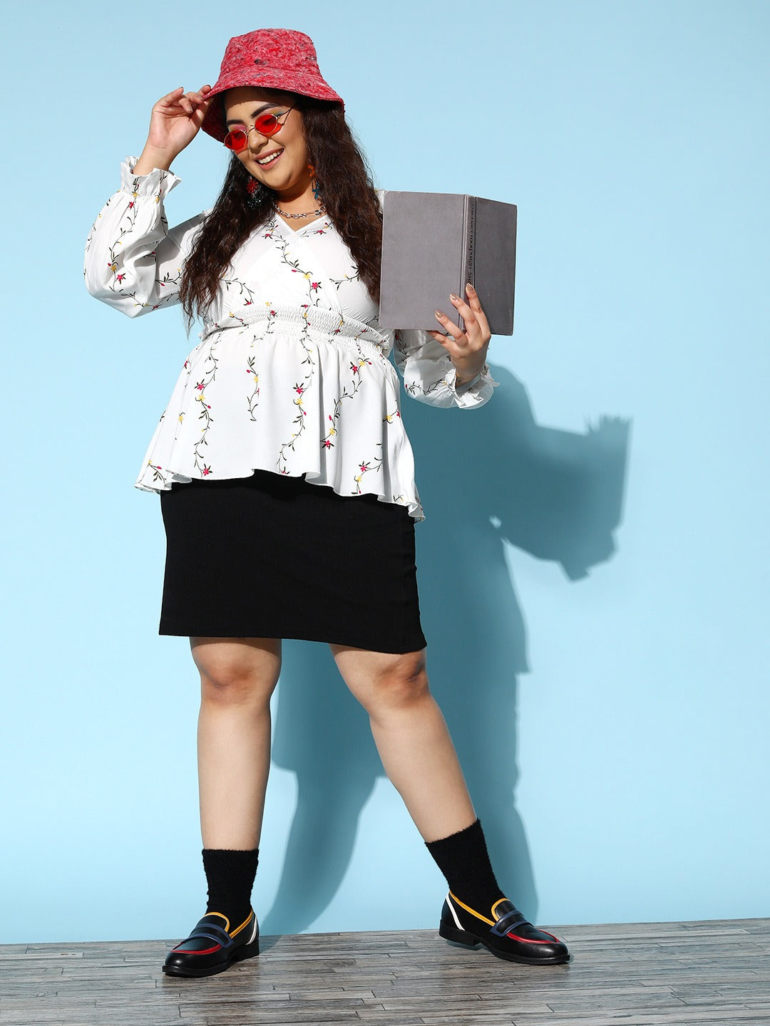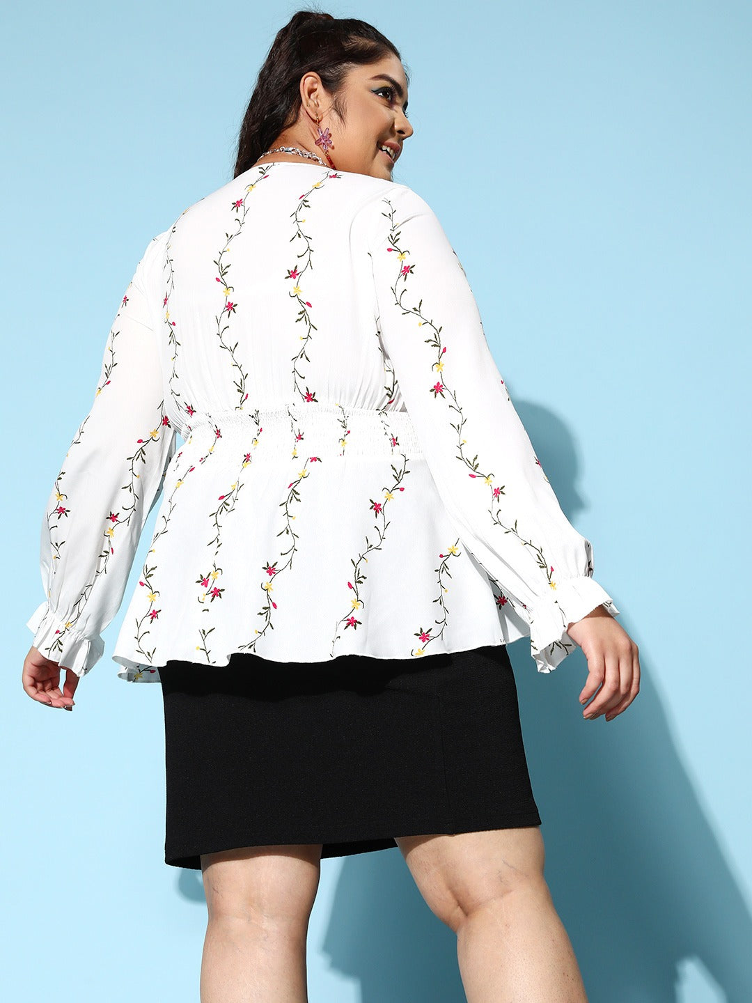Berrylush Women Plus Size White & Red Embroidered Floral Print V-Neck Crepe Smocked Wrap Top