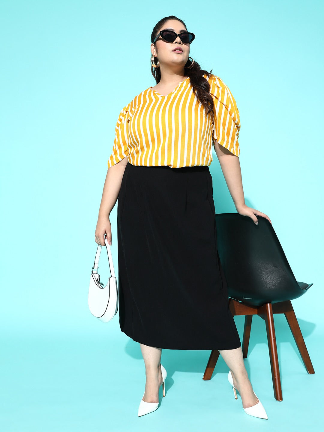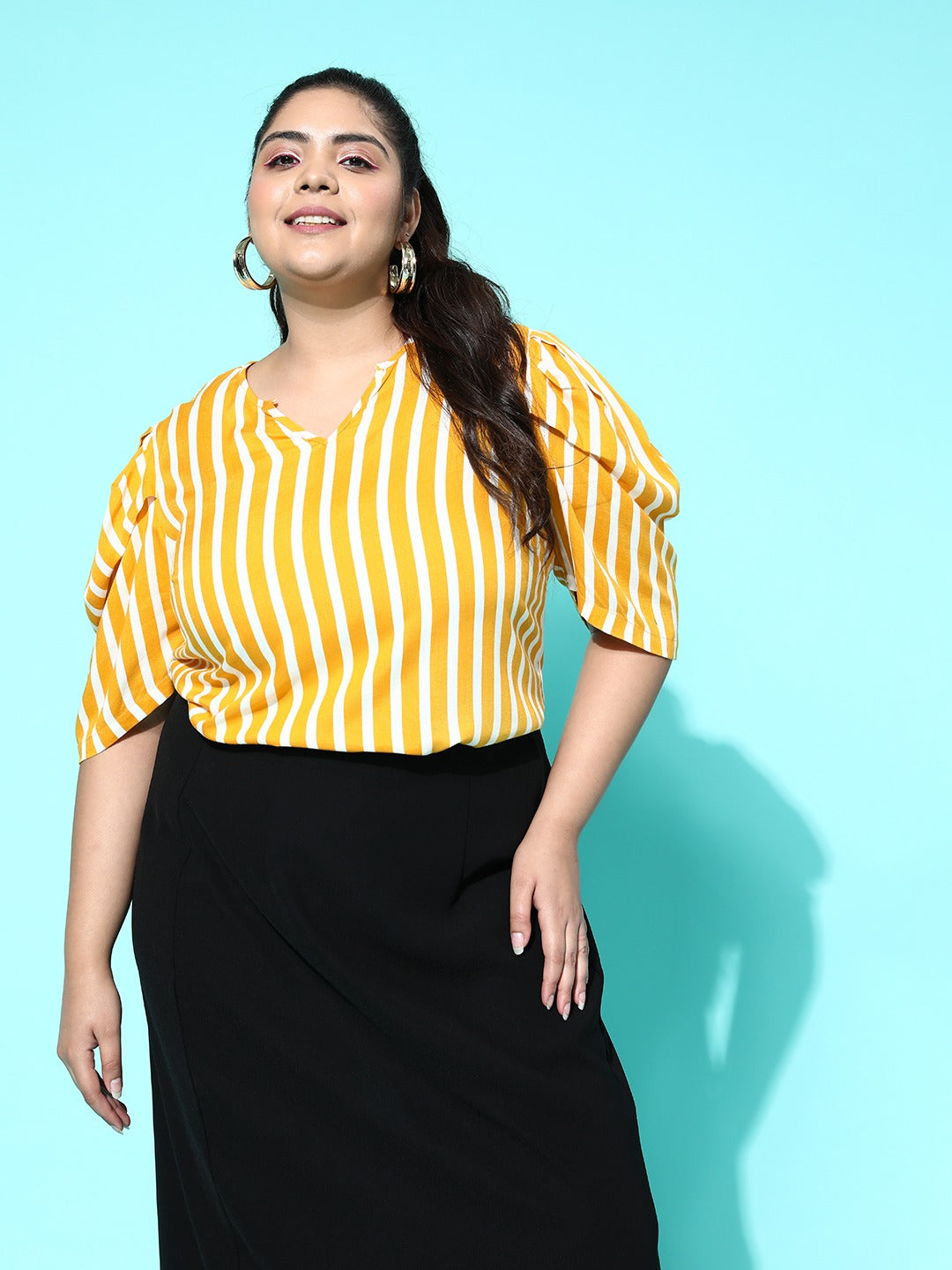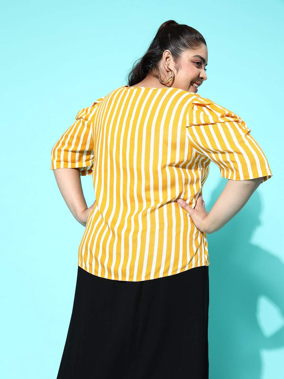 Berrylush Women Plus Size Yellow & White Vertical Striped Print V-Neck Puff Sleeve Cotton Regular Top