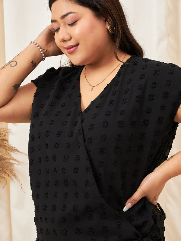Berrylush Curve Women Solid Black Dobby Weave V-Neck Short Sleeve Waist Tie-Up Wrap Regular Top