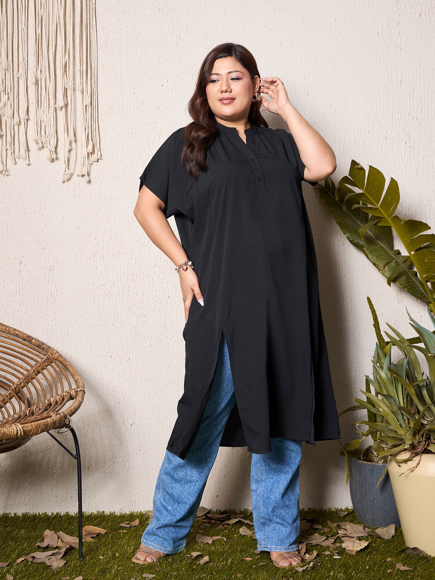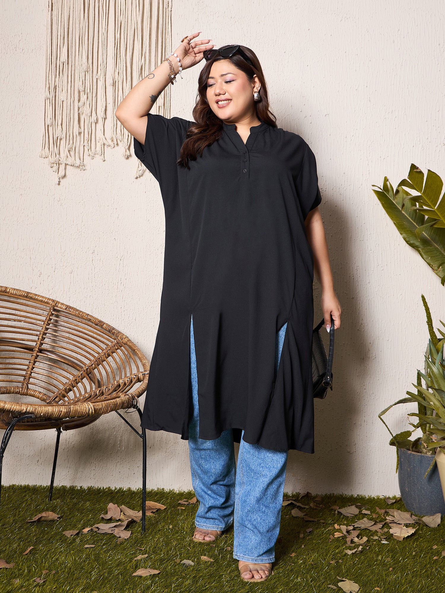 Berrylush Curve Women Solid Black Stand Collar Neck Button-Up Side-Slited Logline Top
