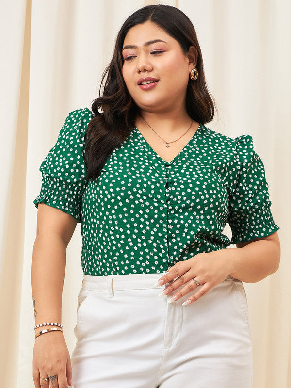 Berrylush Curve Women Green & White Floral Printed V-Neck Puff Sleeves Button-Up Smocked Regular Top