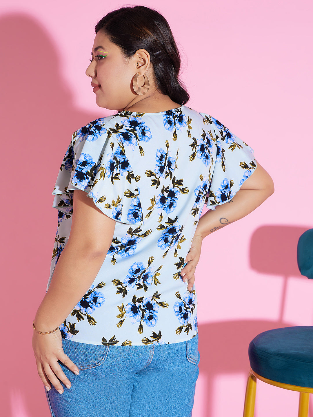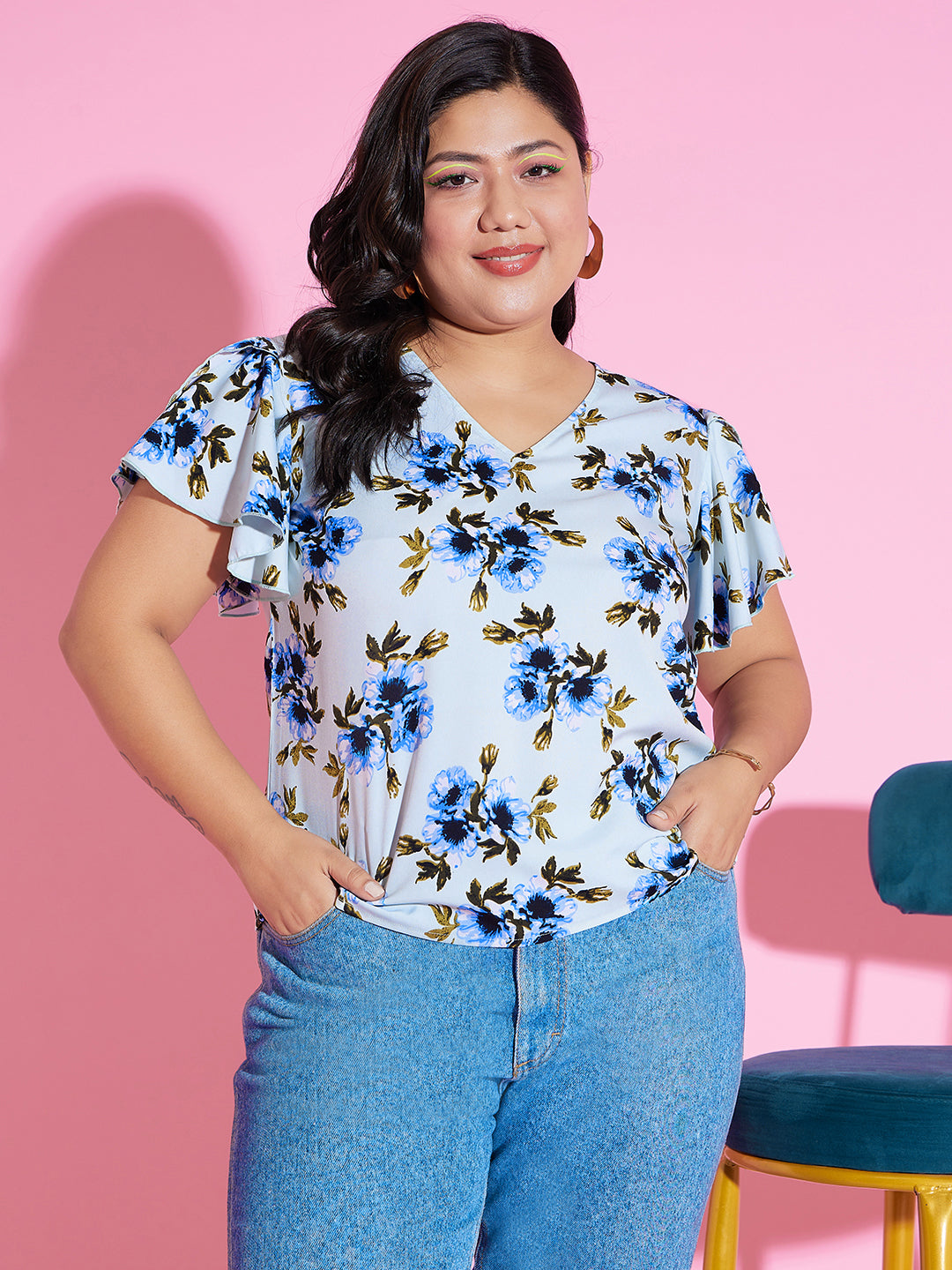 Berrylush Women Plus Size Blue & Green Floral Printed V-Neck Flutter Sleeve Crepe Ruffled Regular Top