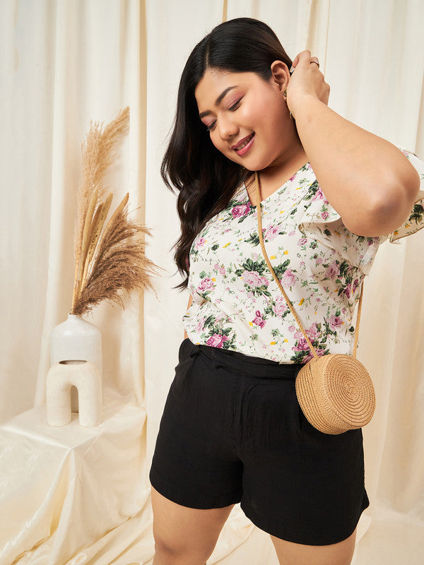 Berrylush Curve Beige Floral Print V-Neck Short Sleeve Regular Top