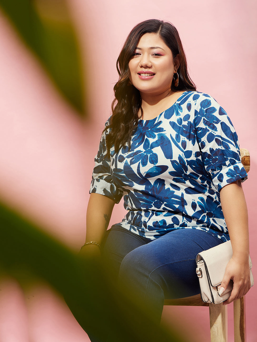 Berrylush Women Plus Size White & Navy Blue Floral Printed Round Neck Woven Cotton Regular Top