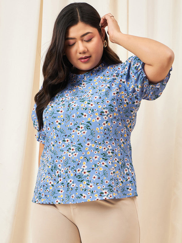 Berrylush Curve Women Blue & White Floral Printed High Neck Puff Sleeves Pleated Regular Top