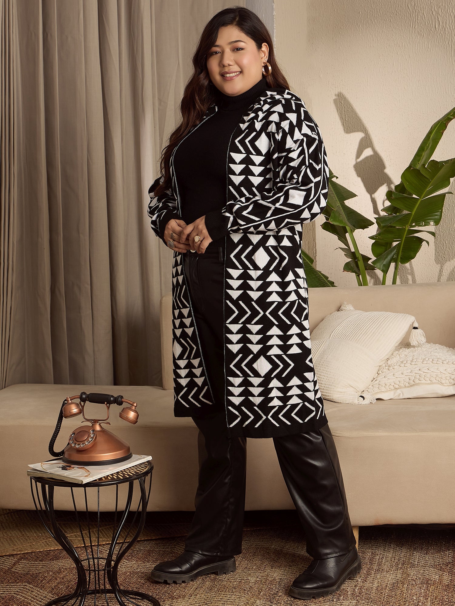 Berrylush Curve Women Black & White Geometric Printed Hood Neck Drop-Shoulder Sleeves Open-Front Ribbed Hem Longline Cardigan