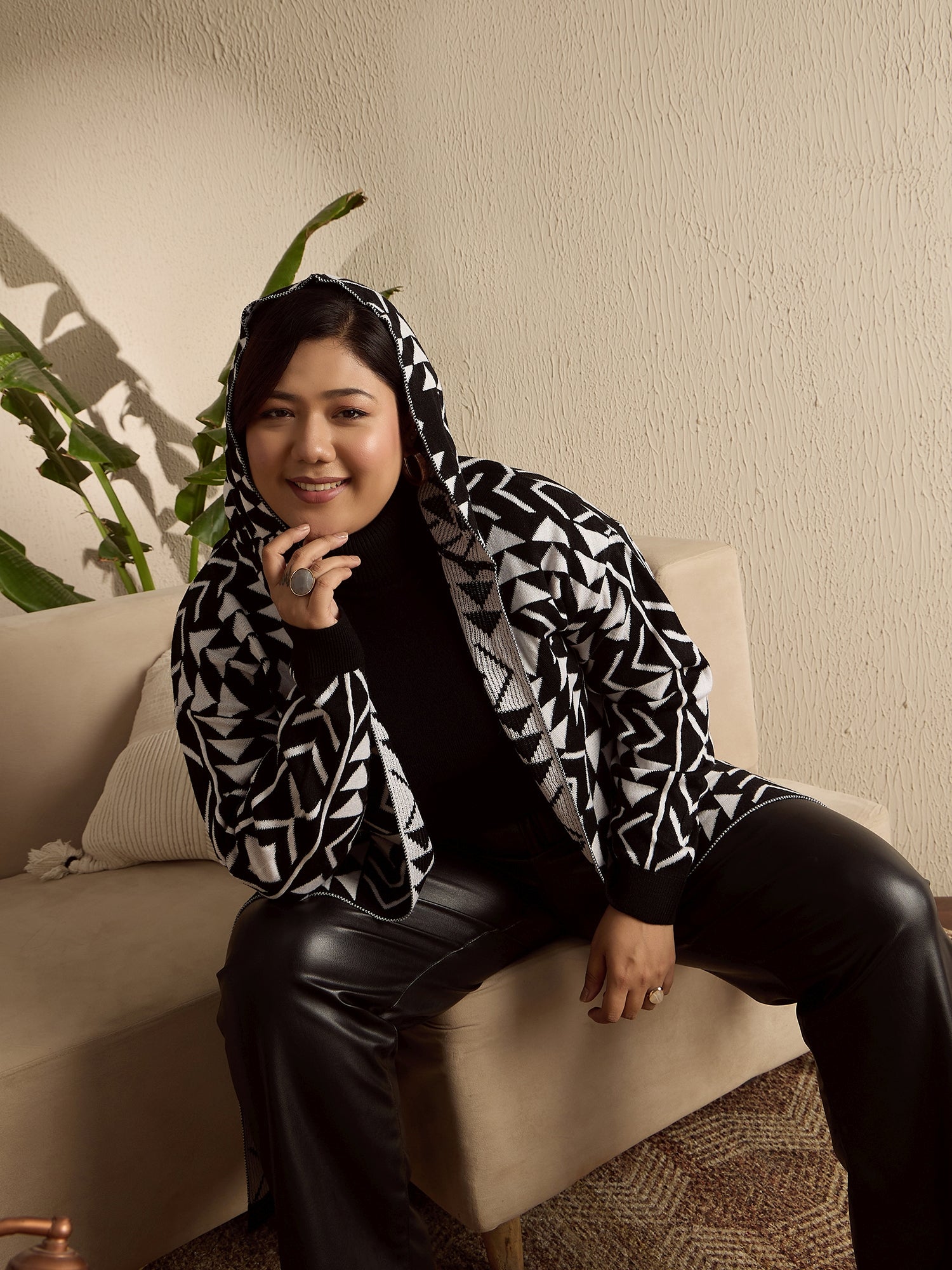 Stay cozy and stylish in this striking Berrylush Curve longline cardigan. The bold geometric print in classic black and white creates a modern, eye-catching look that effortlessly elevates your casual wardrobe. Featuring a comfortable hood and relaxed drop-shoulder sleeves, this knitted piece offers both warmth and contemporary flair. The opaque acrylic fabric ensures durability while maintaining a soft feel against your skin. A ribbed hem adds refined detail to this open-front design, making it perfect for layering. Whether paired with jeans or leggings, this cardigan brings sophistication to your everyday ensembles while keeping you snug and fashionable.