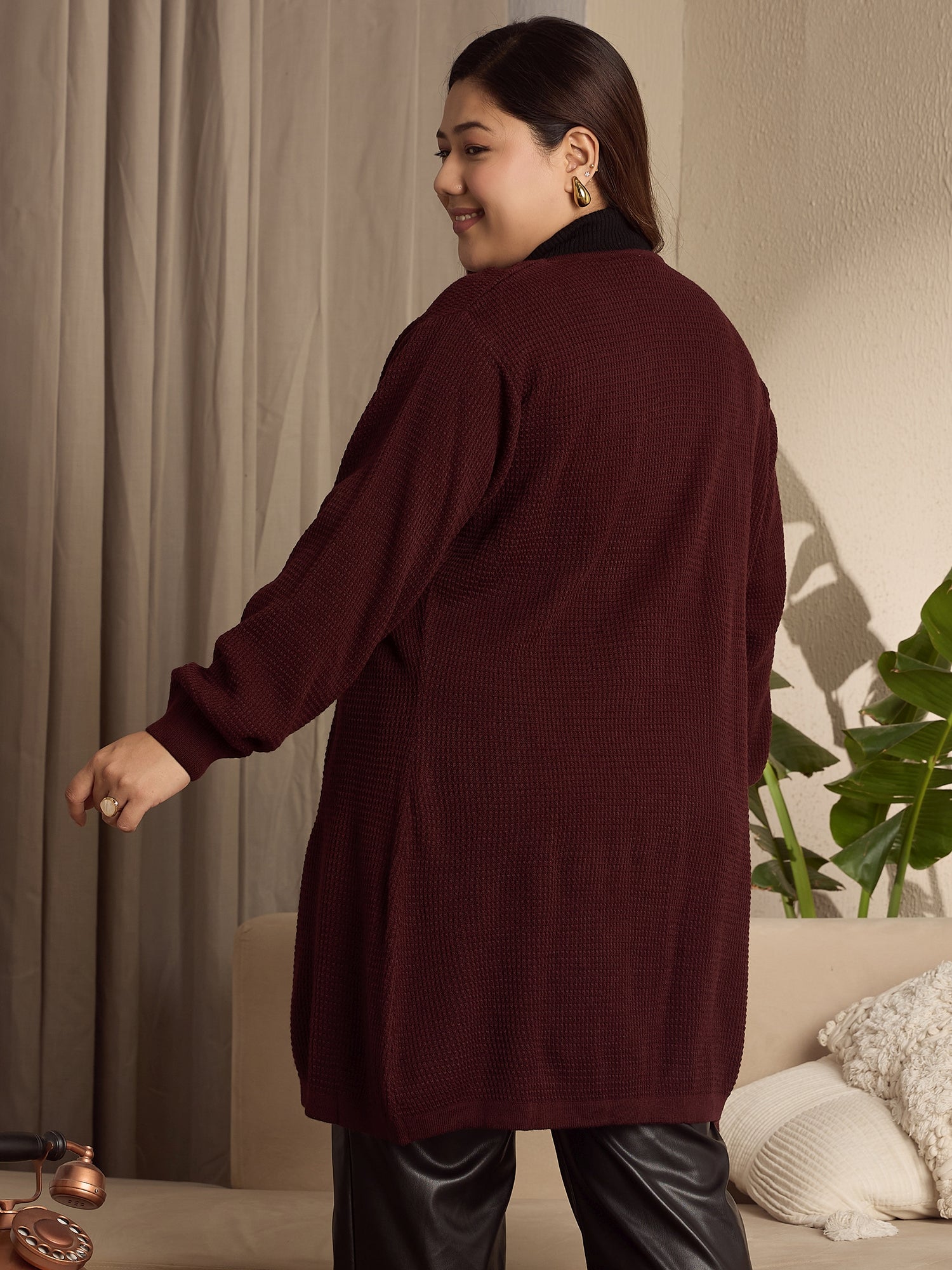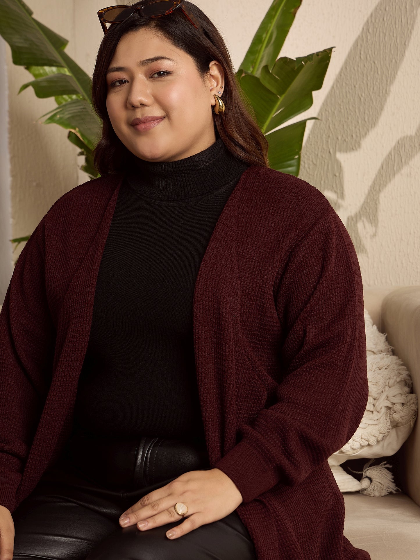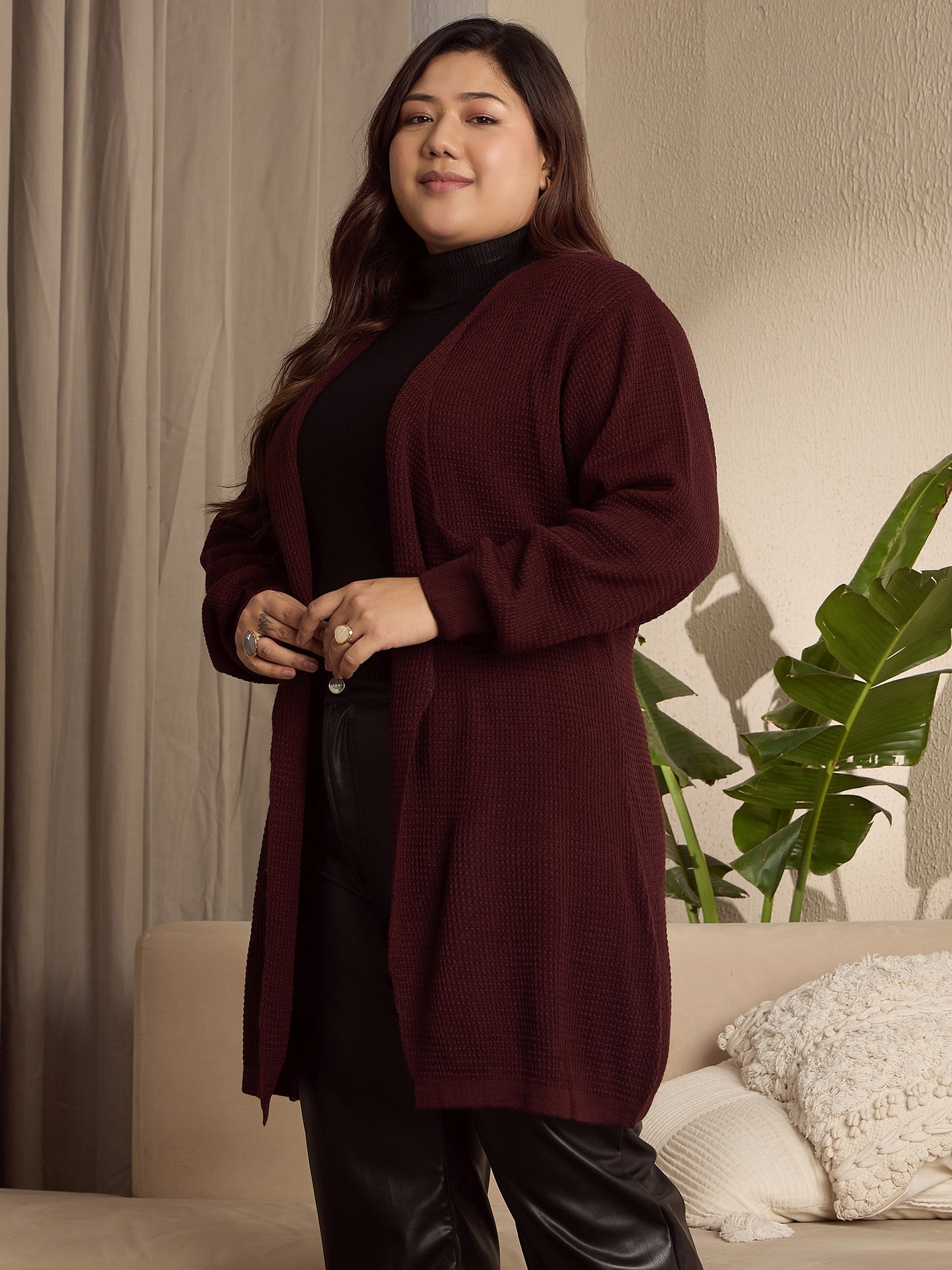 Berrylush Curve Women Solid Maroon Open-Front Acrylic Straight Hem Knitted Longline Cardigan