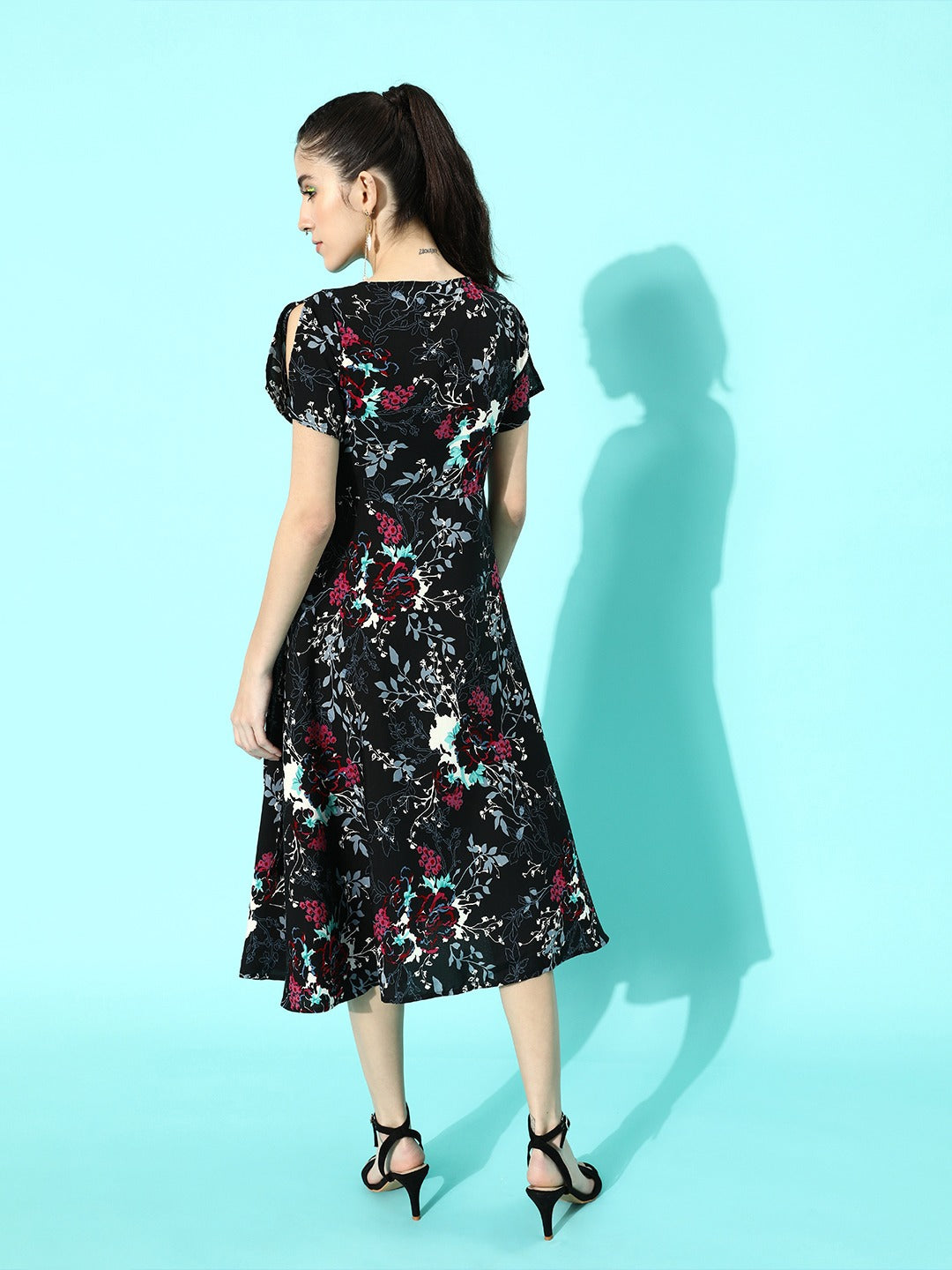 If your love for black shade is unconditional and you’re looking for a mainstay trendy look for any kind of casual occasion, then this beautiful Black Floral Printed V-Neck Slit-Sleeve Wrap Midi Dress from the floral print collection introduced by Berrylush. This dress fulfils your desire for black shade as the amazing mixture of black colour tone with floral print depicts your bold and passionate personality with the tint of nature's beauty. Milled from crepe polyester fabric to offer a sweat-wicking property and the tie-up detail presents a wrap casual style along with a contouring silhouette. Match up this beautiful midi dress with a pair of block heels and your favourite side bag to get an admirable look.