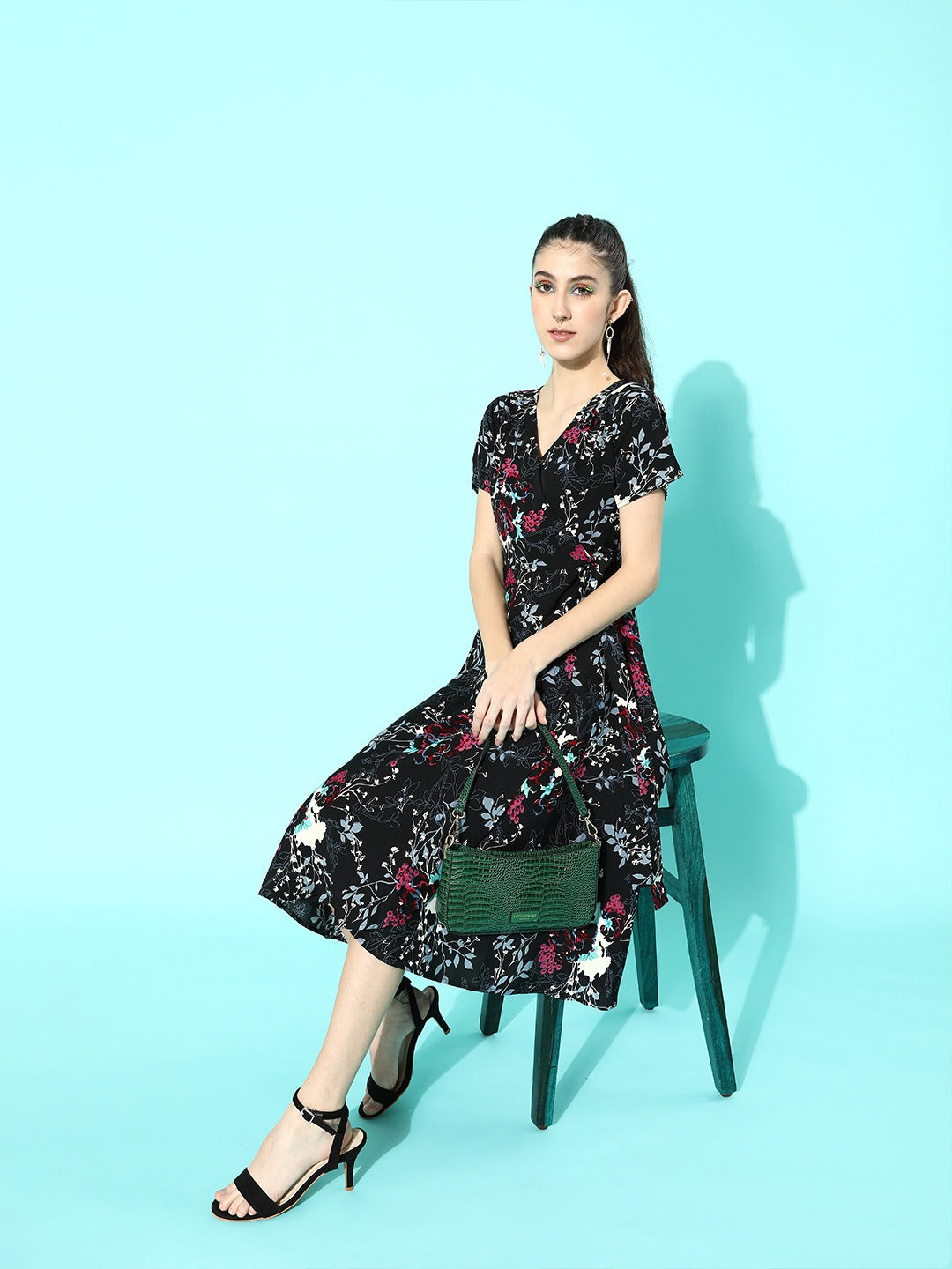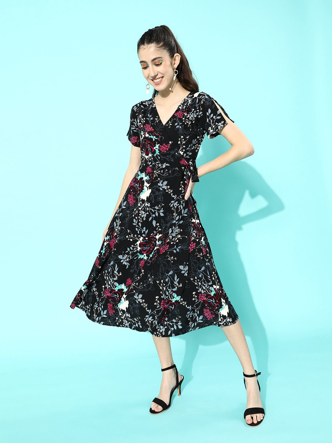 Berrylush Women Black Floral Printed V-Neck Slit-Sleeve Wrap Midi Dress