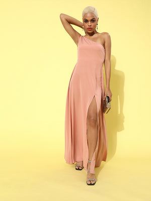 Berrylush Women Solid Pink One-Shoulder Thigh-Slit Flared Maxi Dress