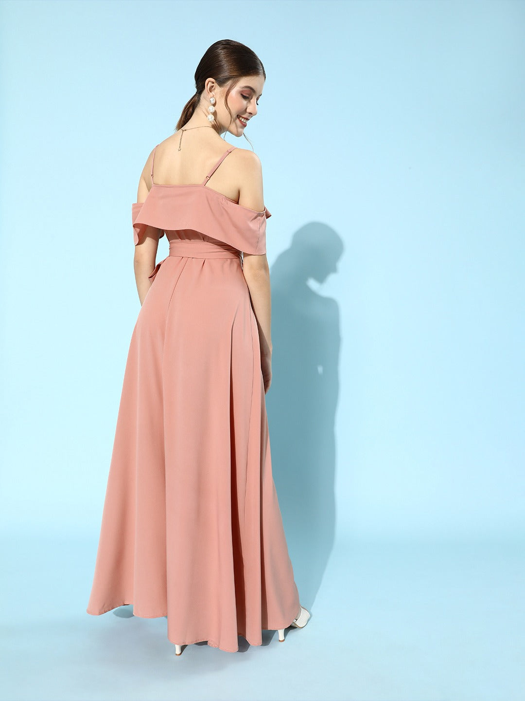 Berrylush Women Solid Pink Cold Shoulder Ruffled Maxi Dress