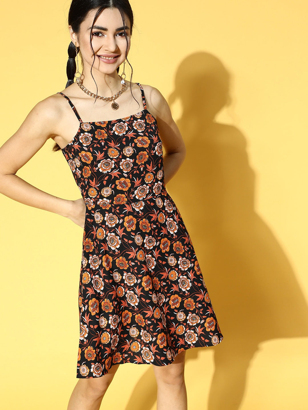 Berrylush Women Black & Coral Floral Printed Square Neck Crepe Flared A-Line Mini Dress