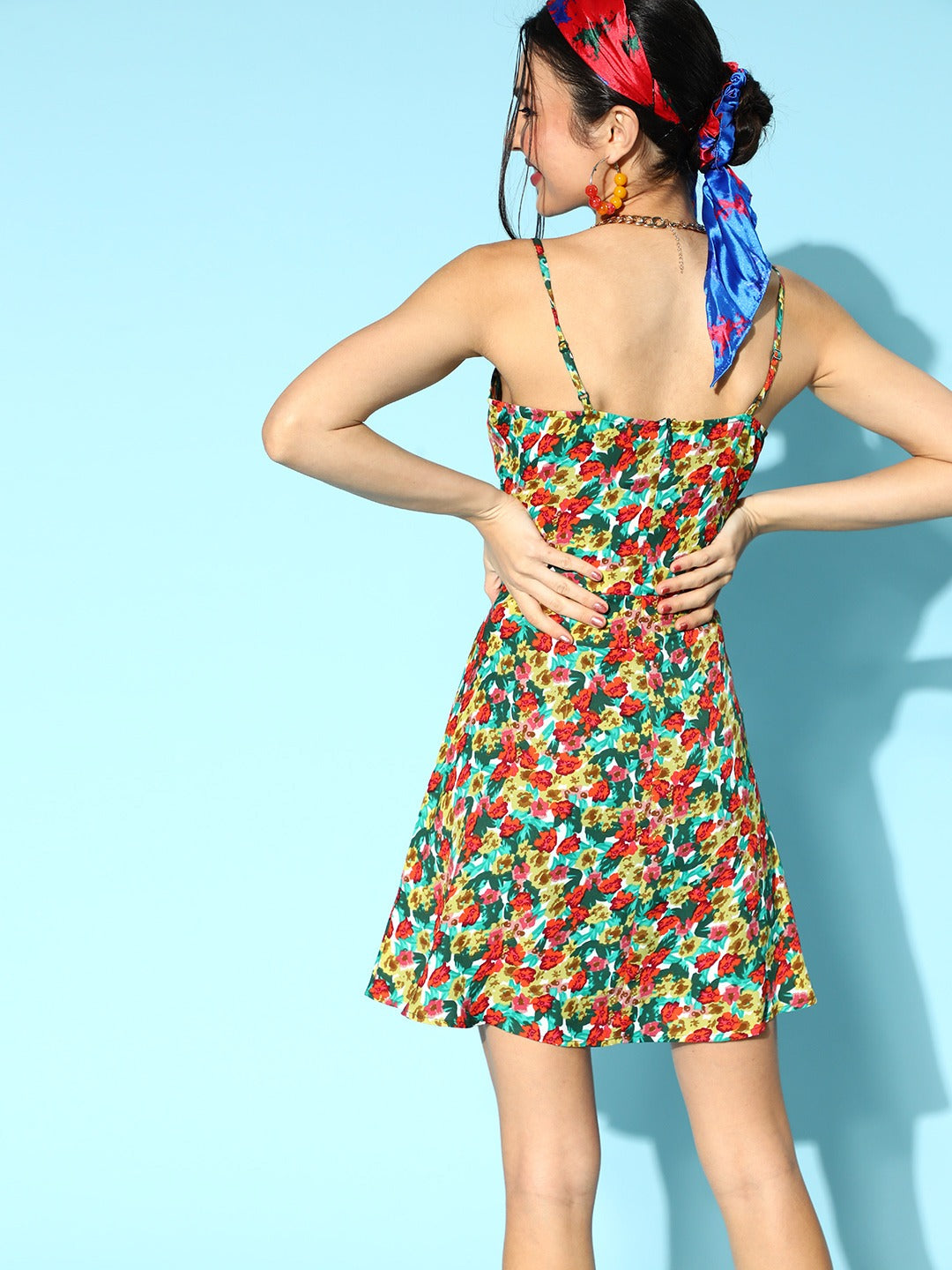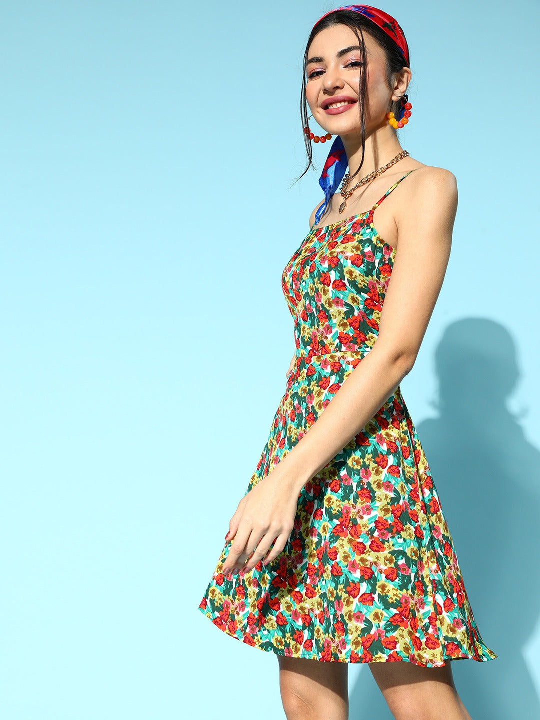 Berrylush Women Red & Green Floral Printed Square Neck Crepe Flared A-Line Mini Dress