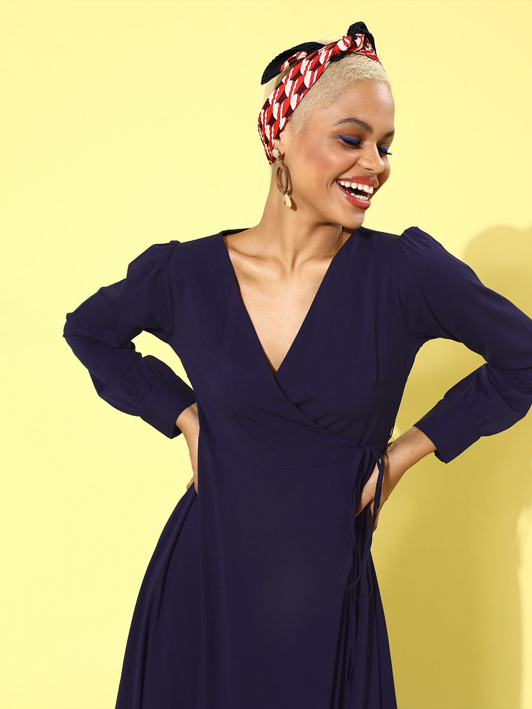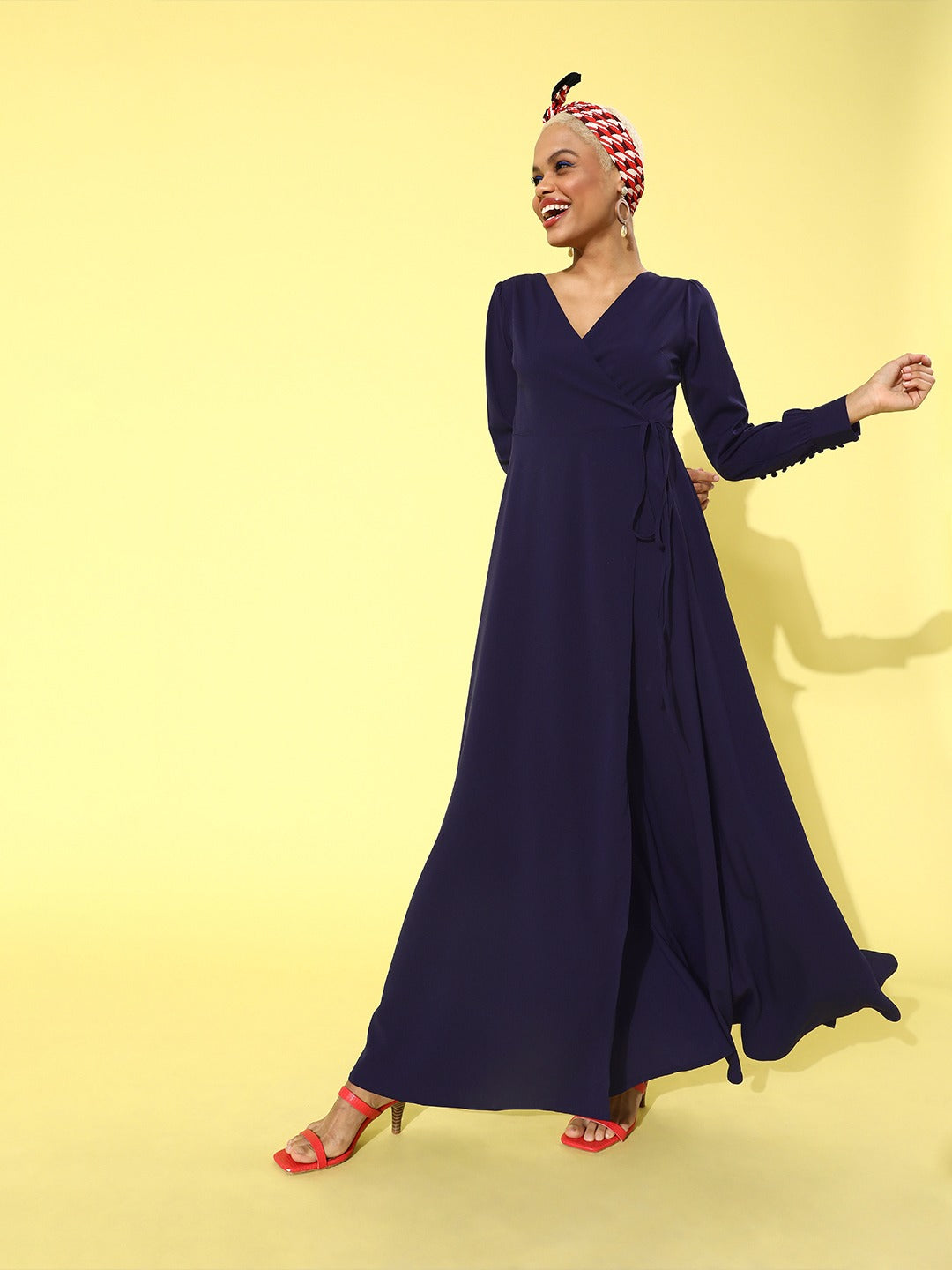 It's time to inject some classic and luxurious essence into your urban wear collection this season with this charming Solid Navy Blue V-Neck Cuffed Sleeves Maxi Dress from Berrylush. You will find this admirable as its navy blue shade adjoins with solid pattern presents a royal and vintage vibe from your casual outlook. Exquisitely designed with a V-neck to give gracious appeal to your beautiful neckline and the long cuffed sleeves add gleaming sheen to your arms. Rendered from crepe polyester fabric to provide airflow and sweat-absorbing features which further makes this dress a perfect outfit to wear for a prolonged duration on warm days by avoiding sweat patches and any kind of discomforts. Complete the look by wearing this enchanting maxi dress with a pair of silver high-heels and a trendy clutch to get a bewitching final look.
