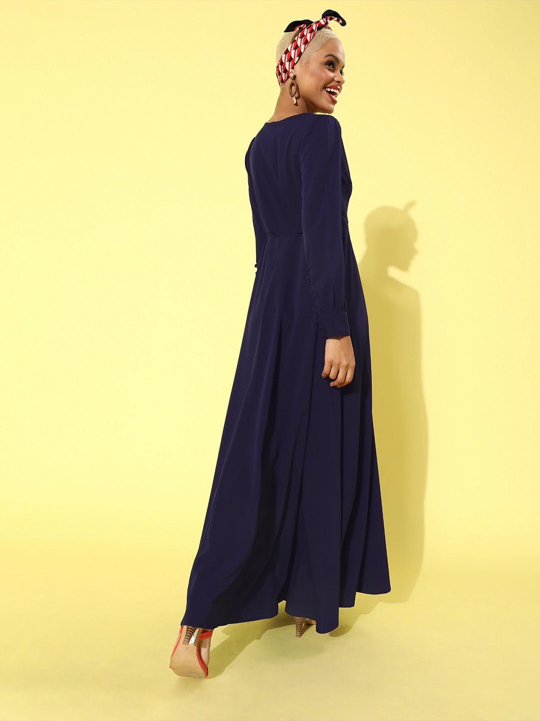 Berrylush Women Solid Navy Blue V-Neck Cuffed Sleeves Maxi Dress
