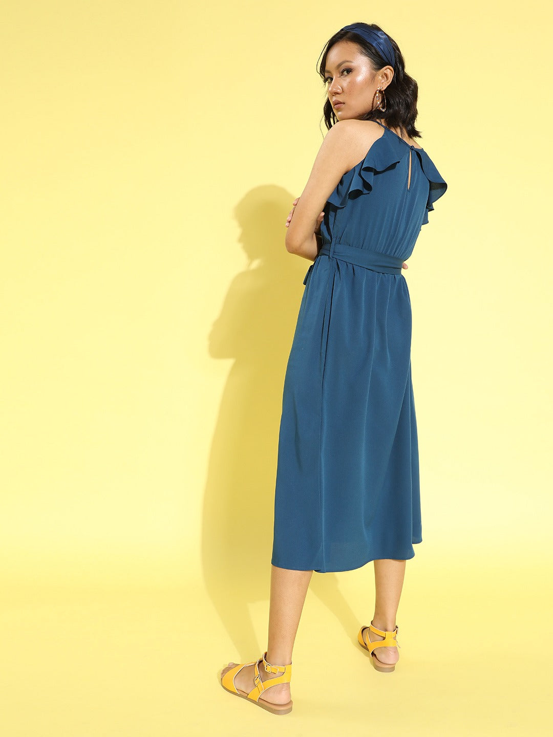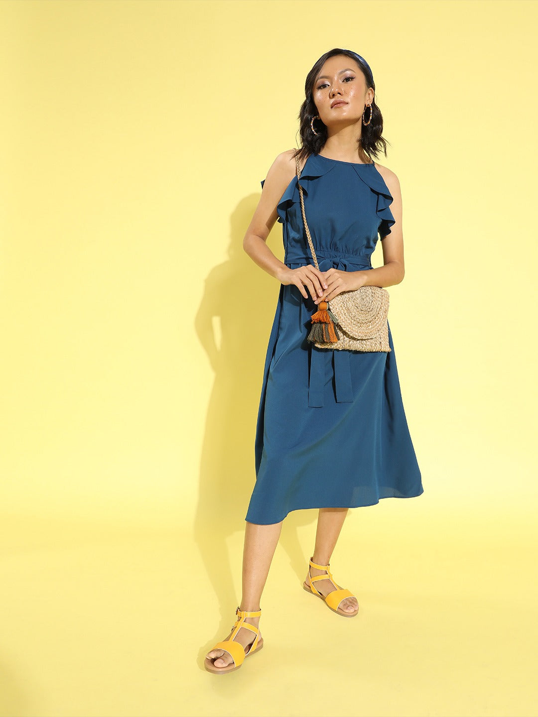 Refine your summer casual wardrobe with contemporary style by adding this bedazzling Solid Blue Round Neck Waist Tie-Up Ruffled Fit & Flare Midi Dress introduced by Berrylush. This midi dress is elegantly designed with a blue solid pattern that depicts your calming personality and a vigorous appeal. Beautifully crafted from crepe polyester fabric to add amazing drape and wrinkle resistance. Button closure lets you easily remove and wear this dress. To create a gracious and comfy look, you can also wear this charming midi dress with a pair of strappy heels and a sling bag.