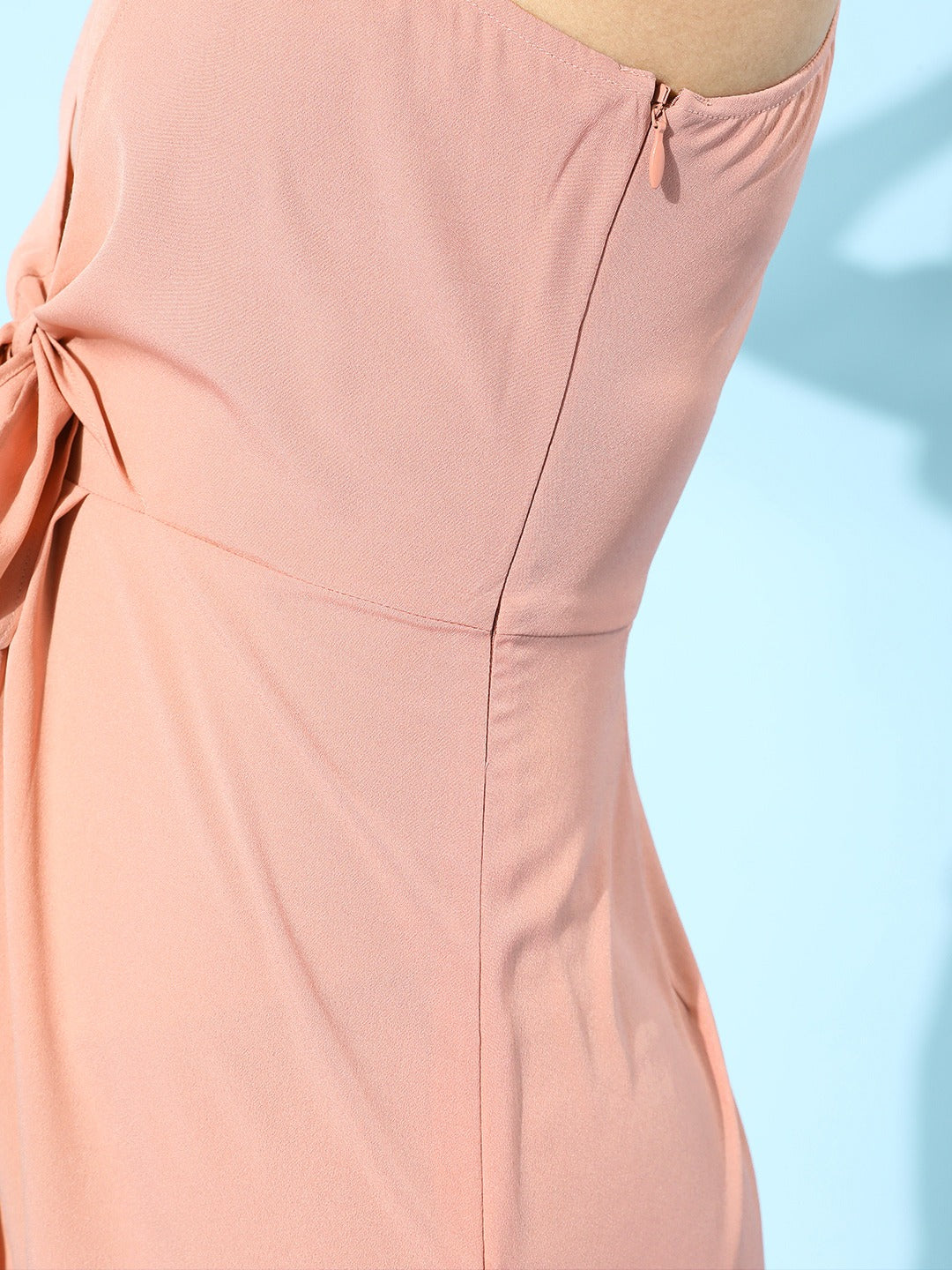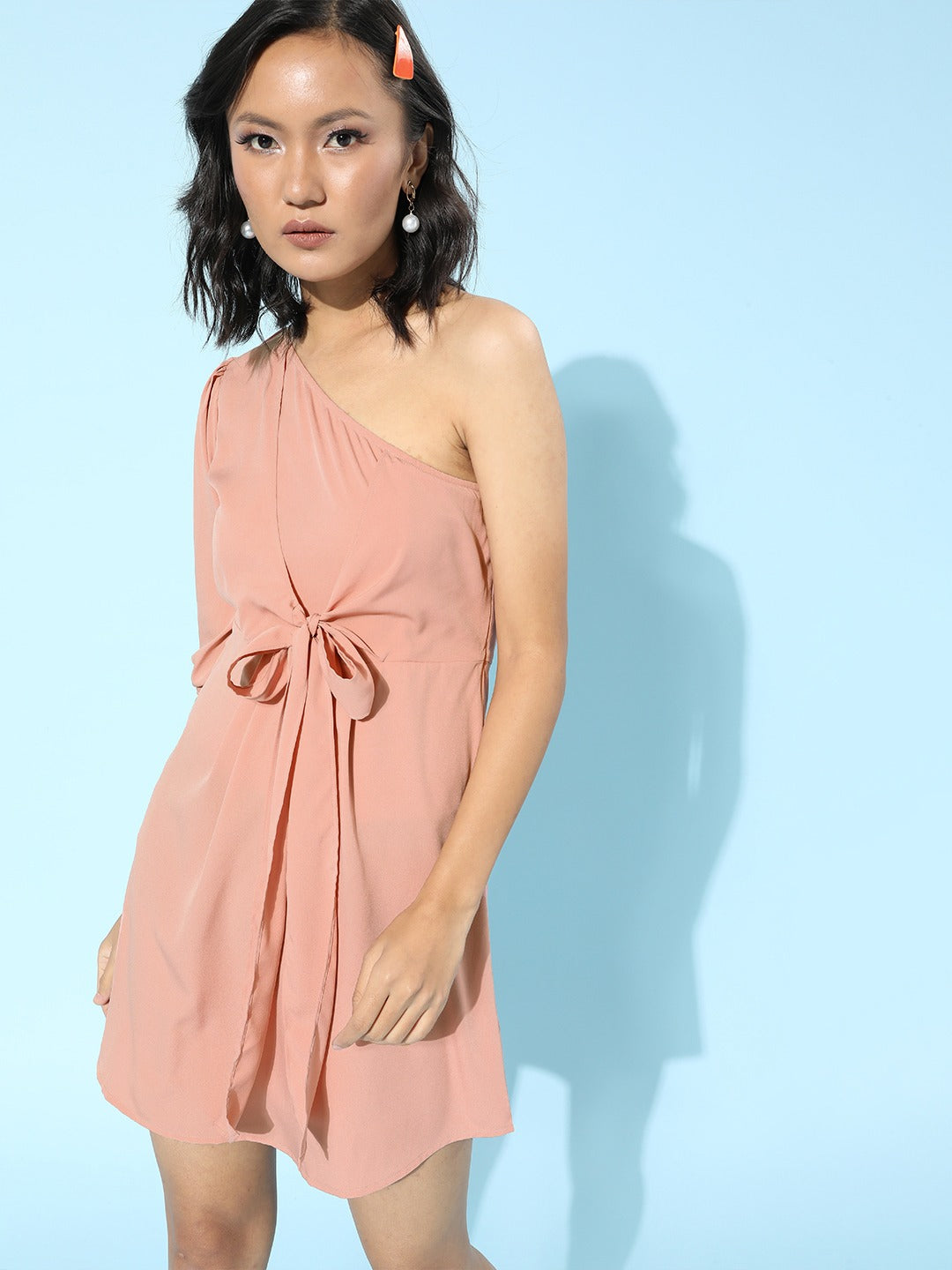 Berrylush Women Solid Pink One-Shoulder Neck Waist Tie-Up Flared A-Line Mini Dress