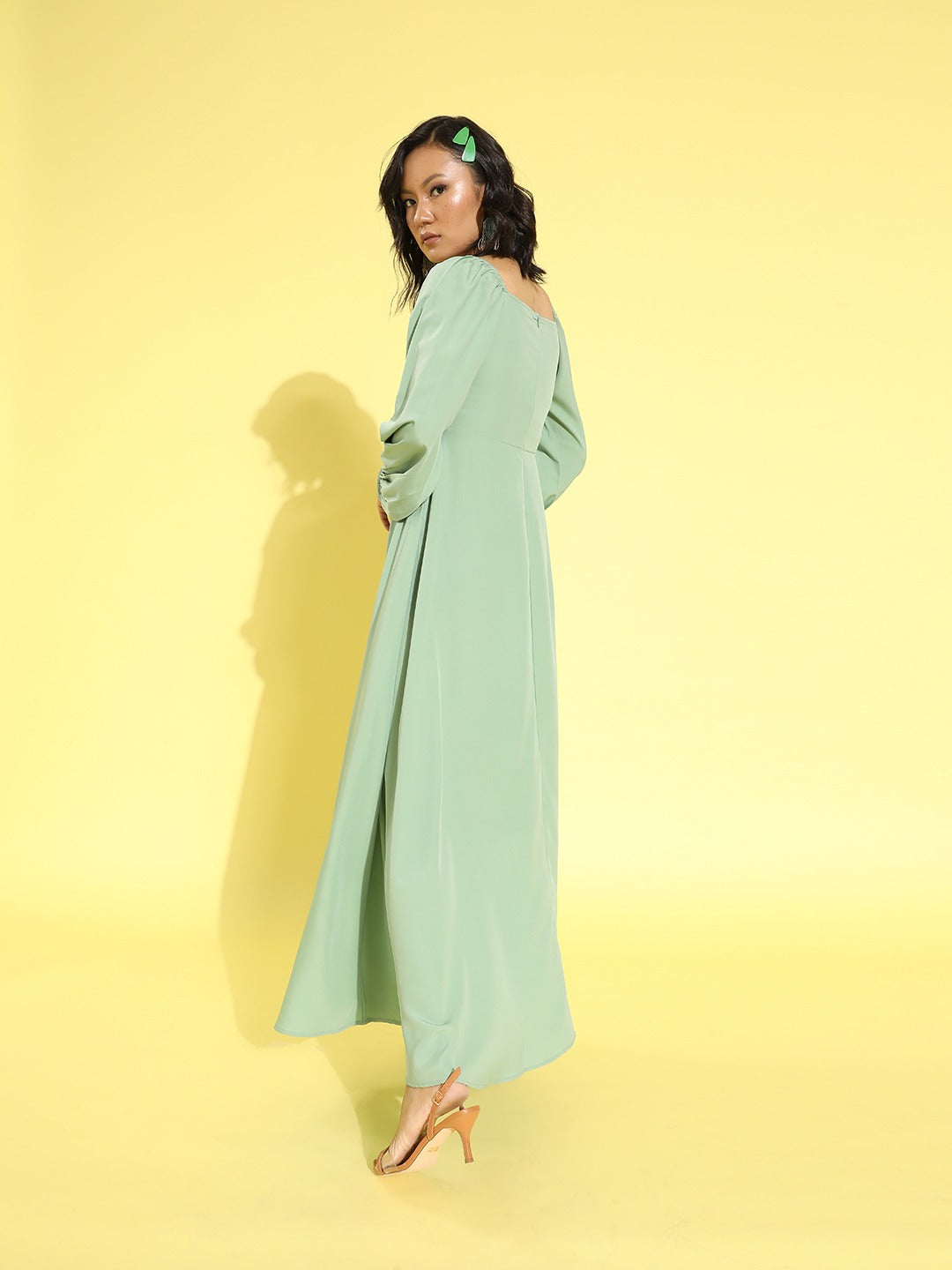Evoke a feeling of refreshment by injecting the dominance of green shade within your casual wardrobe with this gorgeous Solid Green Square Neck Puff Sleeves Crepe Flared Maxi Dress designed by Berrylush. The beautiful duo of green shade with solid pattern expresses the nature of life and renewal with a sophisticated texture. The square neck design and long puffed sleeves create a fashionable appearance by giving a vigorous highlight to your neckline and arms. Rendered from crepe polyester fabric to provide a luxurious formula of keeping this maxi dress lightweight along with a smart appearance. Team up this spectacular maxi dress with a pair of caged heels and a side bag to create a fashionable appearance.
