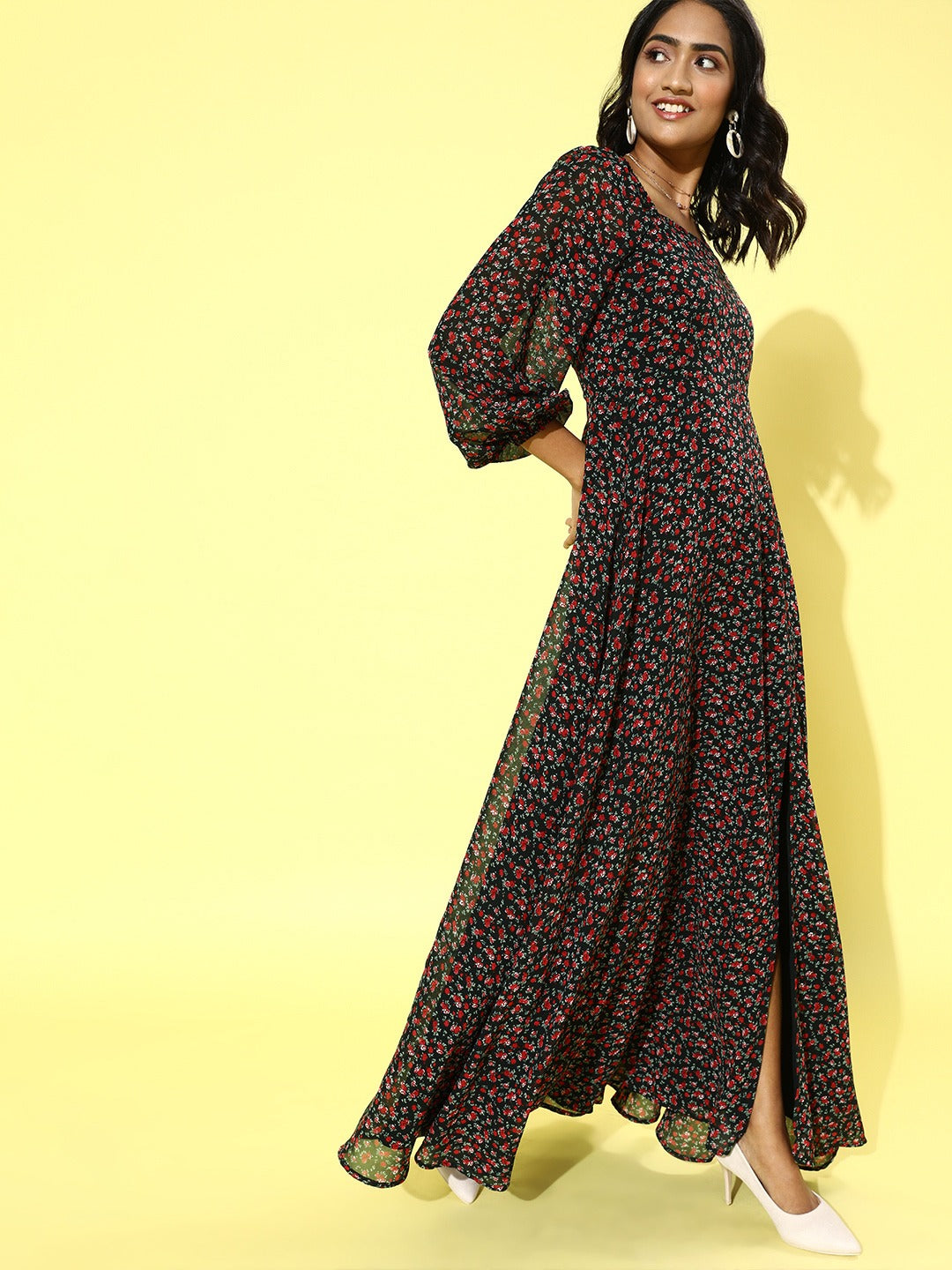 Berrylush Women Black & Red Floral Printed Square Neck Puff Sleeves Crepe Flared Maxi Dress