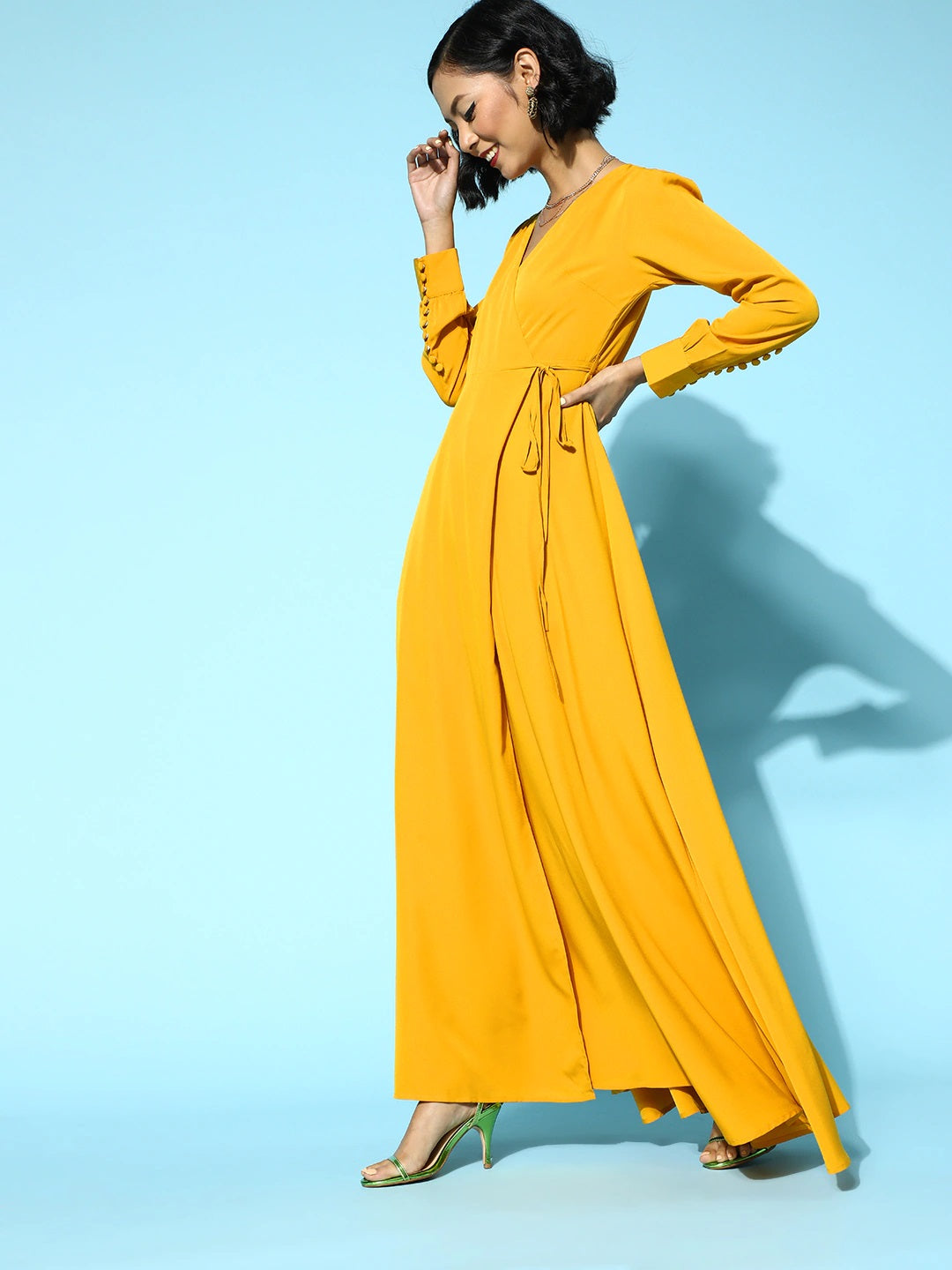 Amplify your casual closet with the bedazzling essence of yellow shade and cheerful vibe by getting this enchanting Solid Yellow V-Neck Waist Tie-Up Thigh-High Slit Flared Maxi Dress from Berrylush. The most fascinating attribute of this maxi dress is the long cuffed sleeves which give an attractive coverage to your arms while keeping your arms during cold winter days. Moreover, this amusing maxi dress is prepared from crepe polyester fabric which keeps this outfit lightweight along with breathable which makes it a suitable outfit to wear for a prolonged duration. You can wear this maxi dress with a pair of your favourite high-heels and a sling bag to get an admirable look.