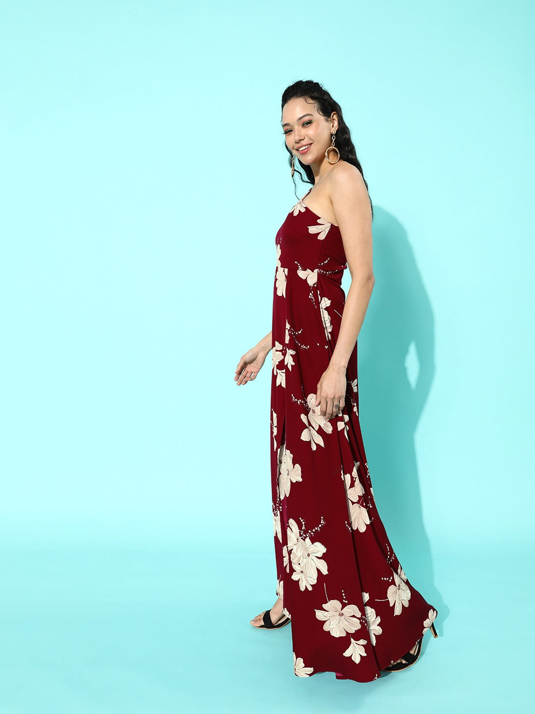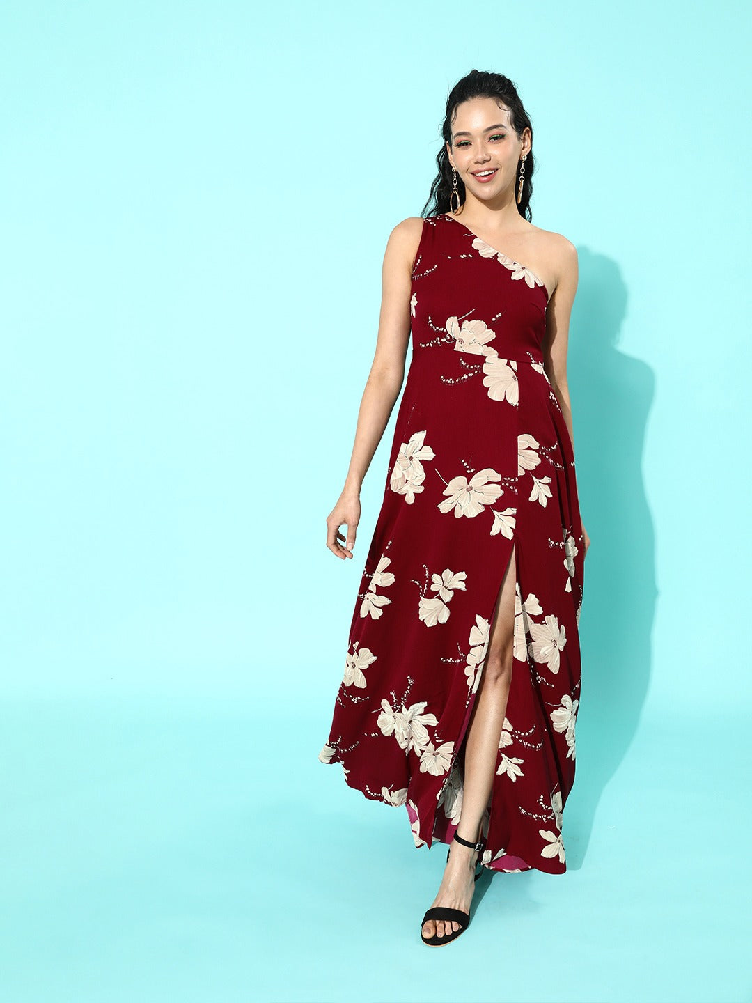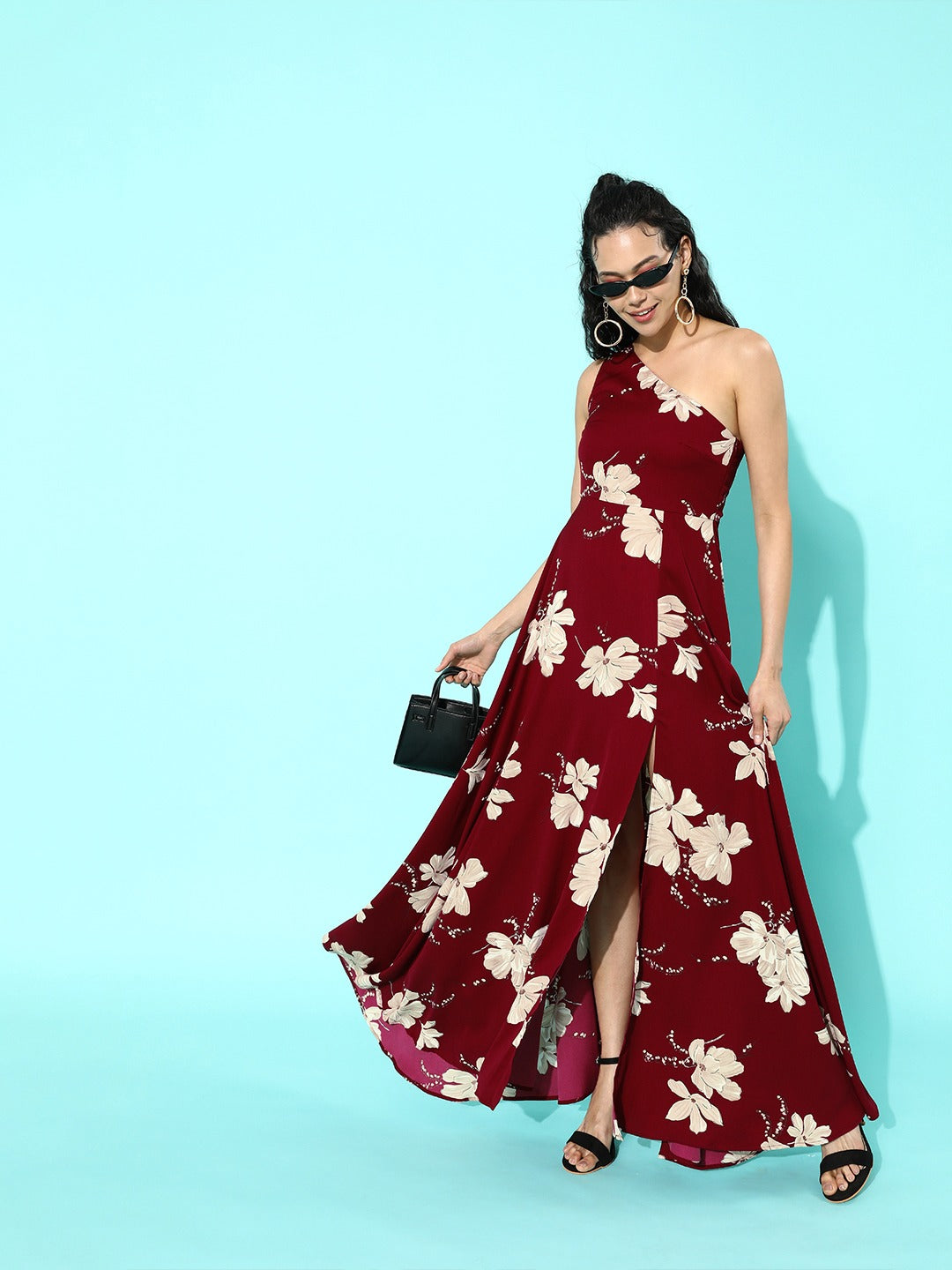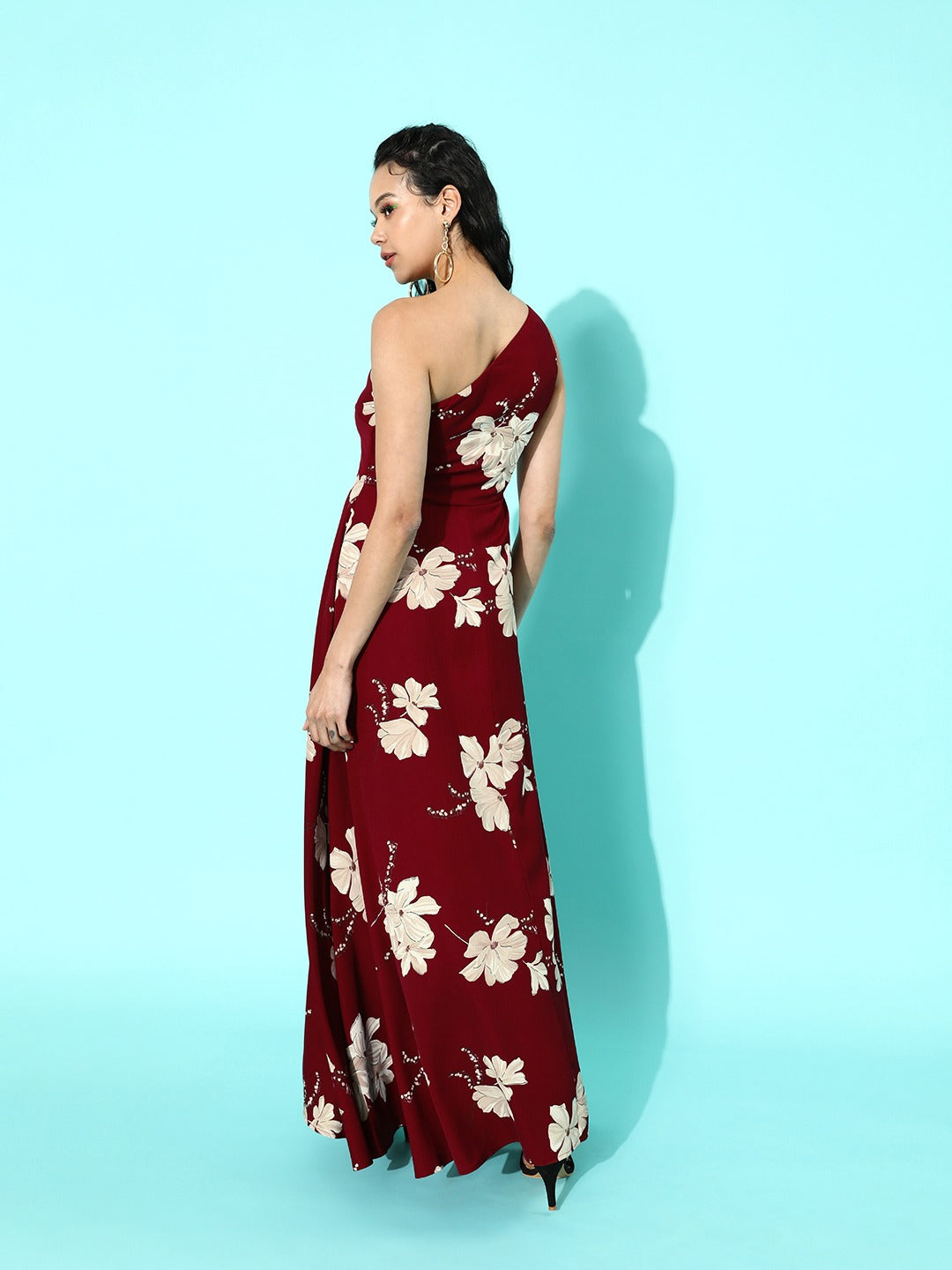 Berrylush Women Maroon & Beige Floral Printed One-Shoulder Thigh-Slit Maxi Dress