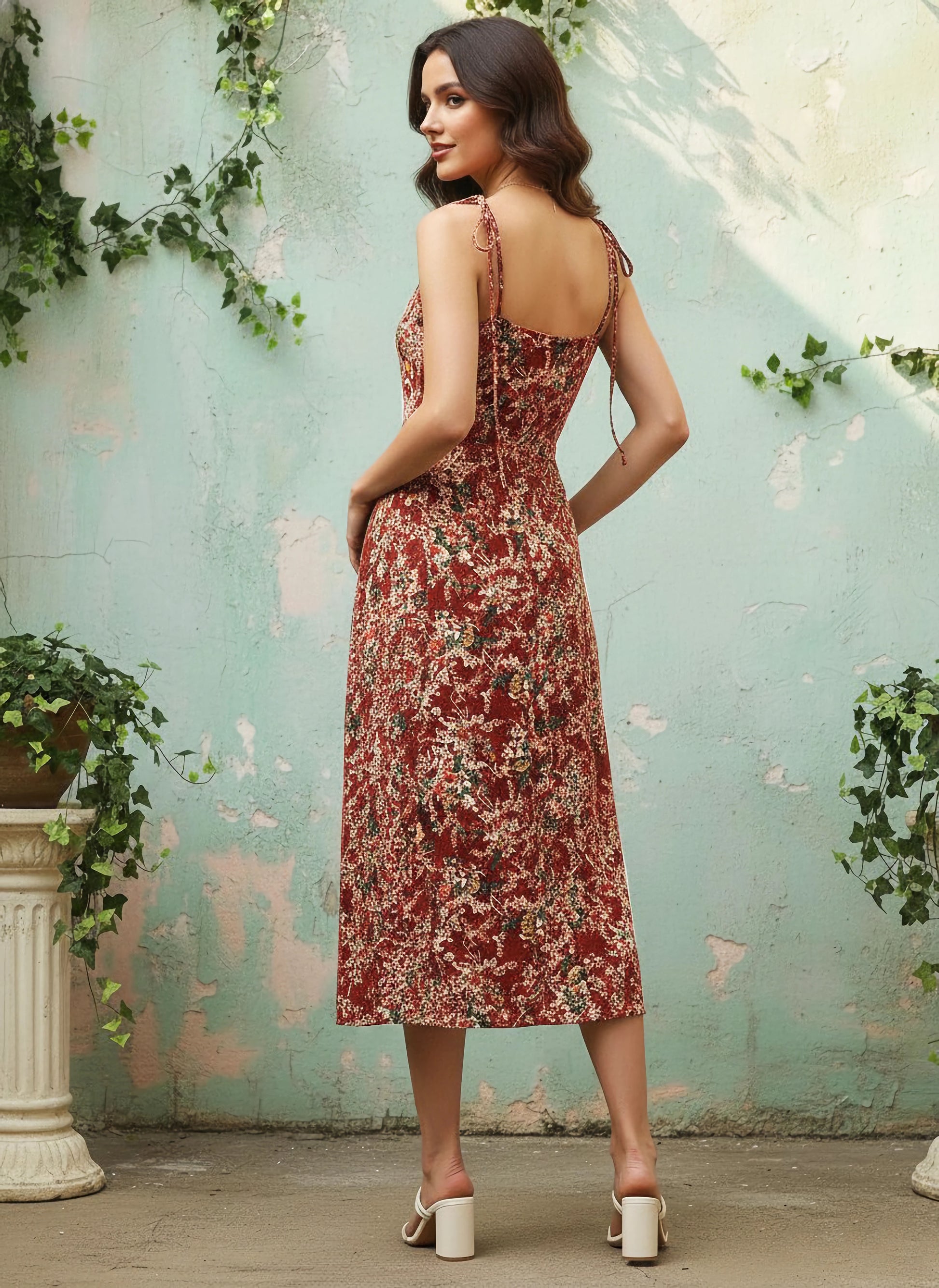 Berrylush Women Maroon Floral Printed Sweetheart Neck Tie-Up Strap Fit & Flare Midi Dress