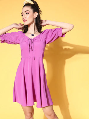 Berrylush Women Solid Purple Puff Sleeve Crepe Fit & Flare Mini Dress