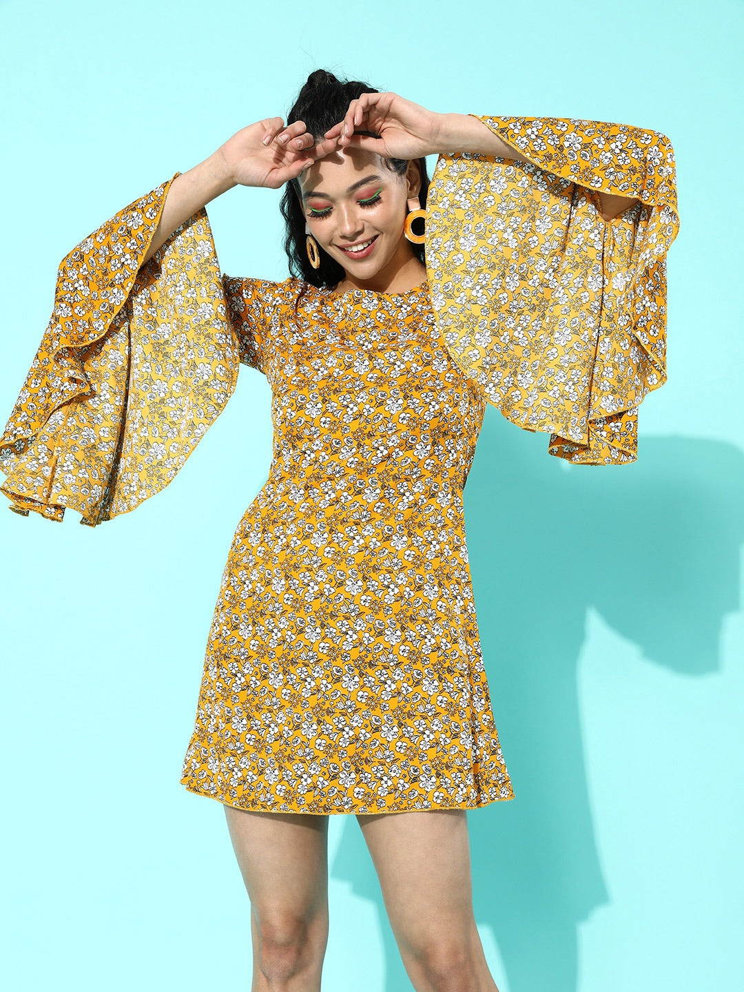 Berrylush Women Mustard Yellow Floral Printed Round-Neck Crepe A-Line Mini Dress