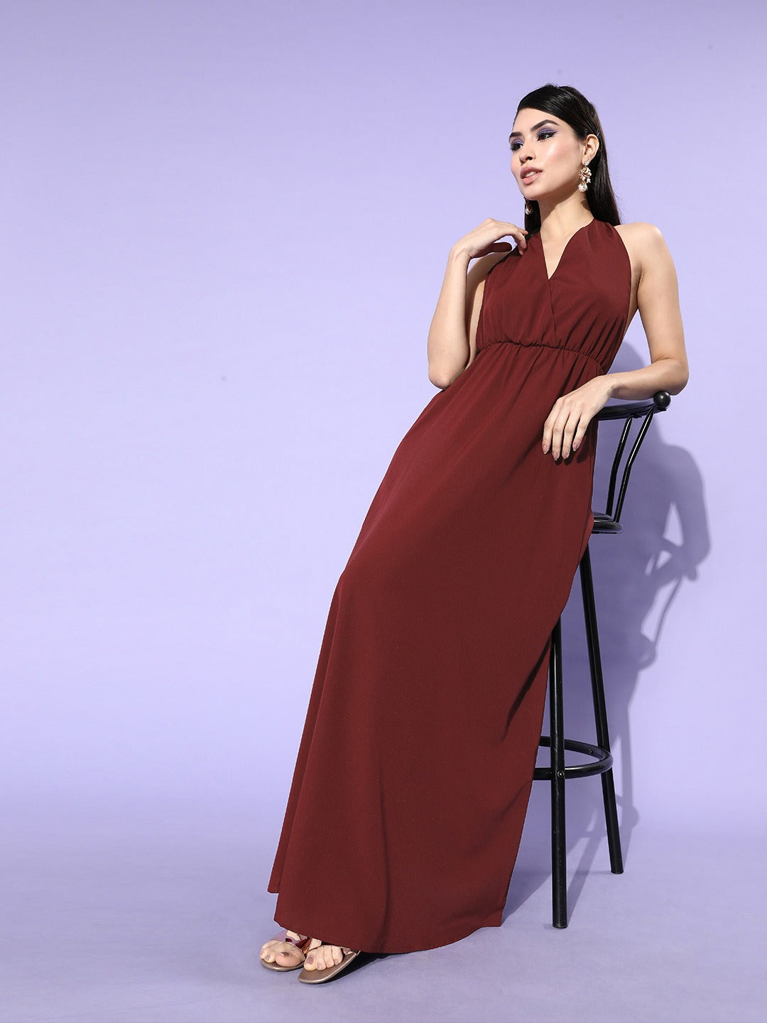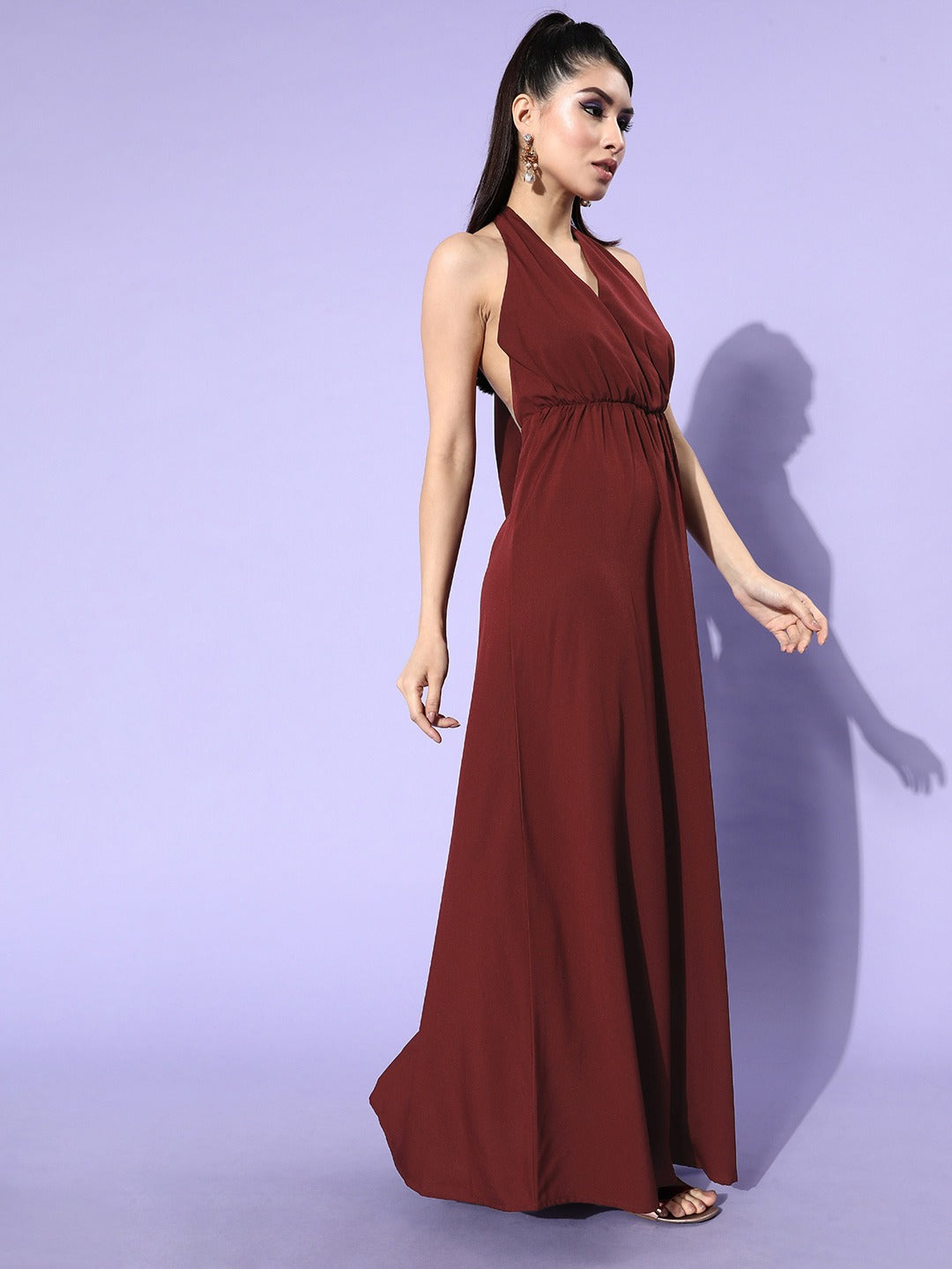 Berrylush Women Solid Maroon Halter Neck Sleeveless Crepe Maxi Dress