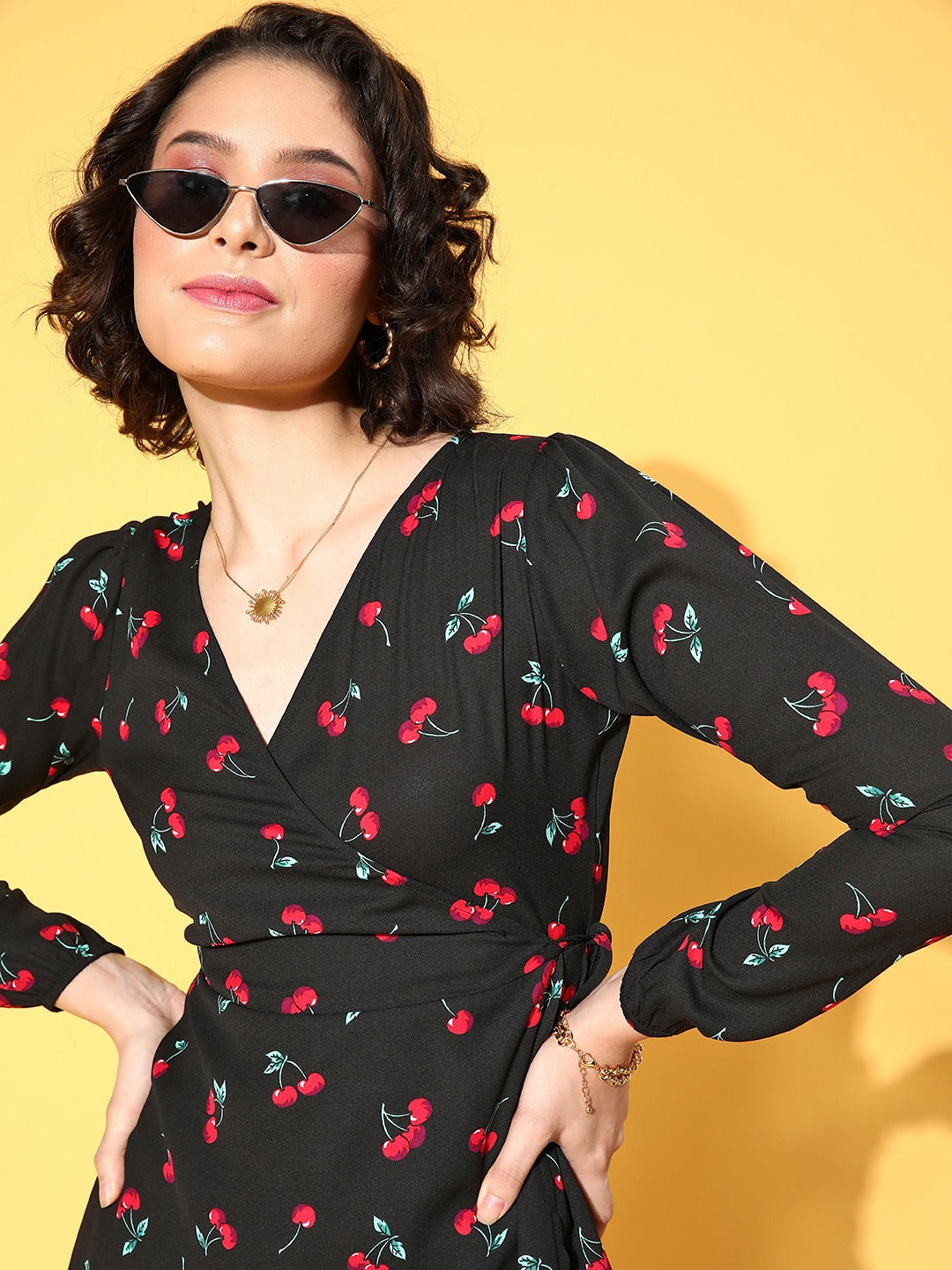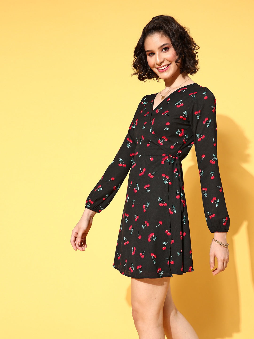 Berrylush Women Black & Red Cherry Printed V-Neck Waist Tie-Up Tulip Hem Wrap Mini Dress