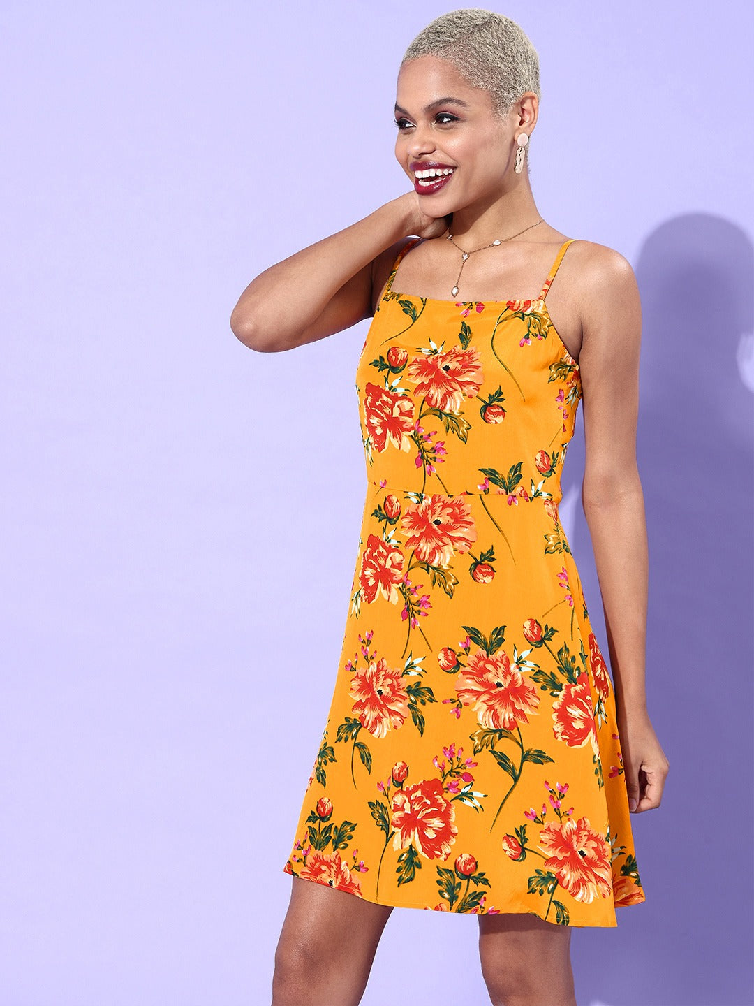 Carry optimism in your casual style by wearing this Yellow & Red Floral Printed Square Neck Mini Dress from Berrylush. The seductive and weightless strappy shoulder features your charming look and will get both the element of style & support. The square neckline fits almost every kind of body type to create an attractive look. To gift your appearance the most loved fit & flare silhouette of this dress. The mini length of this casual outfit helps you to attain a natural increase in your height. For sustaining the youthful aura this fascinating outfit comes with an allover floral print. Pair this full of energetic outfit with low-top sneakers and a cute backpack to complete your overall look. Define the casual style of your fashionista soul with Berrylush.