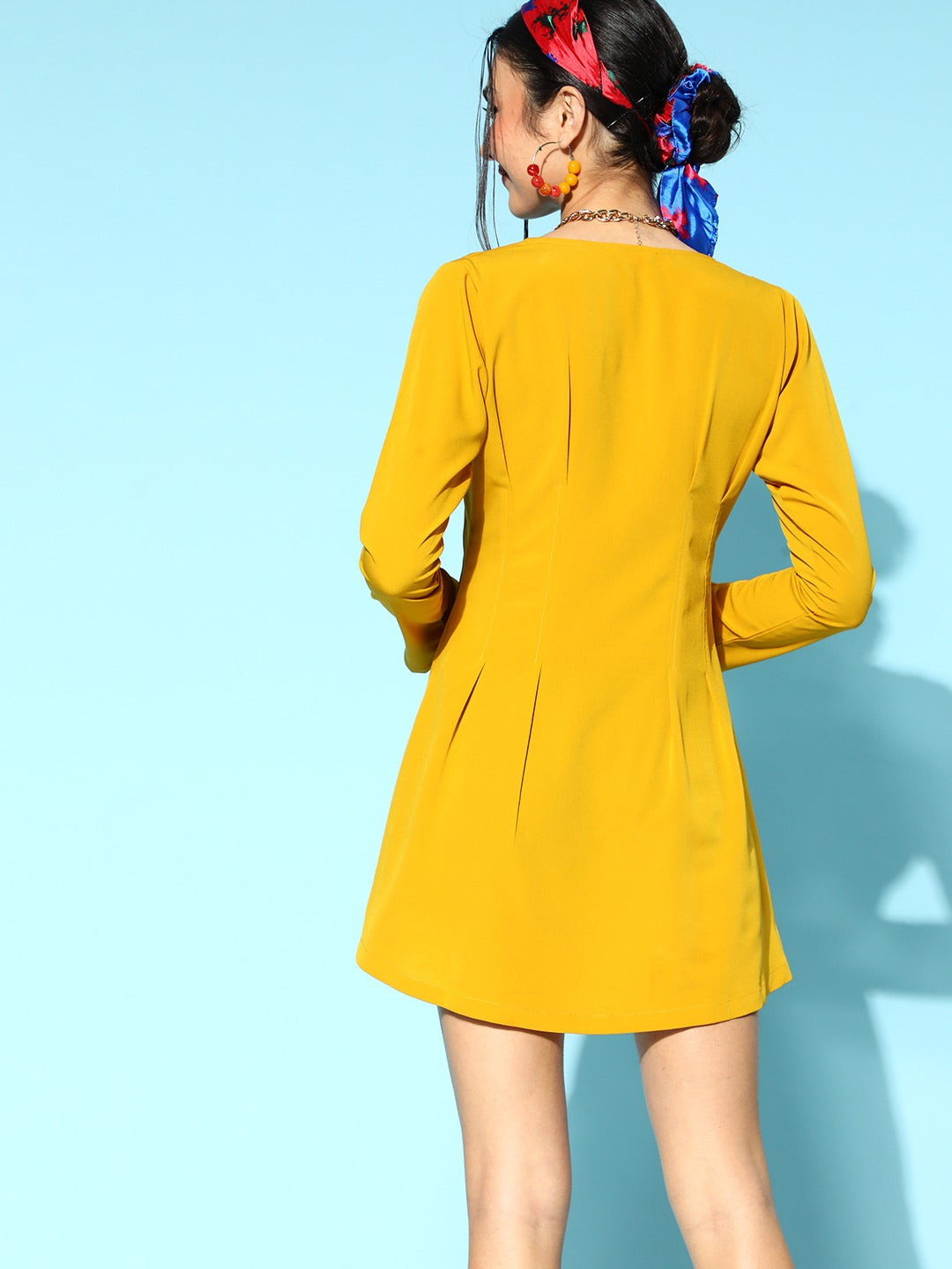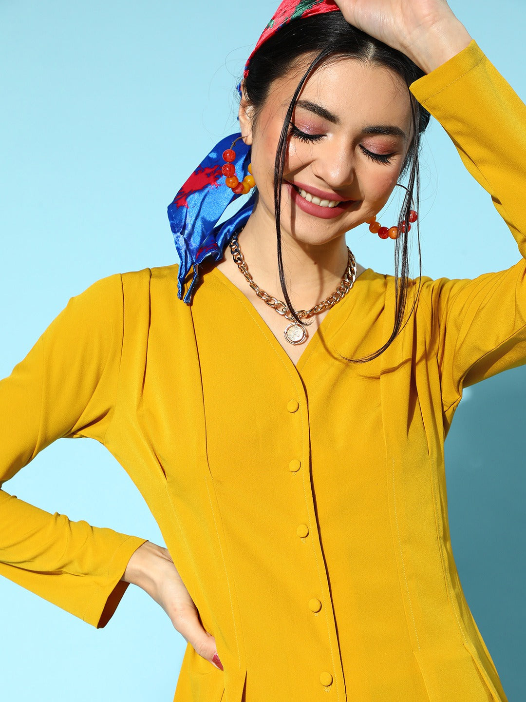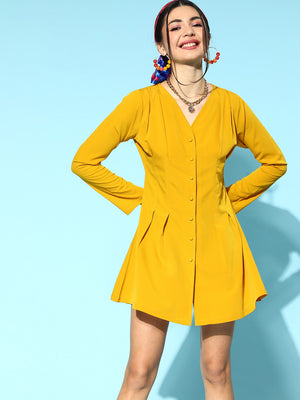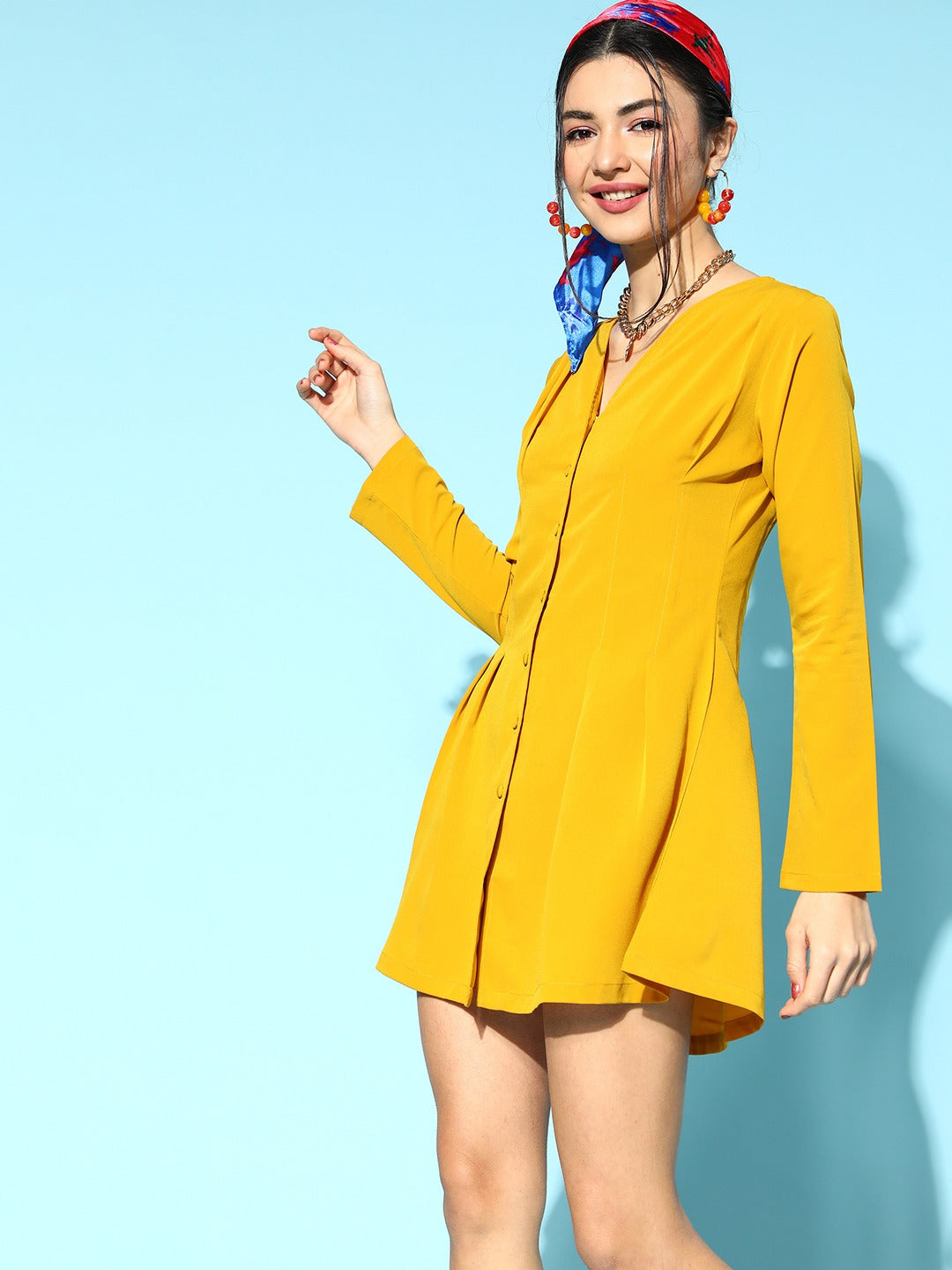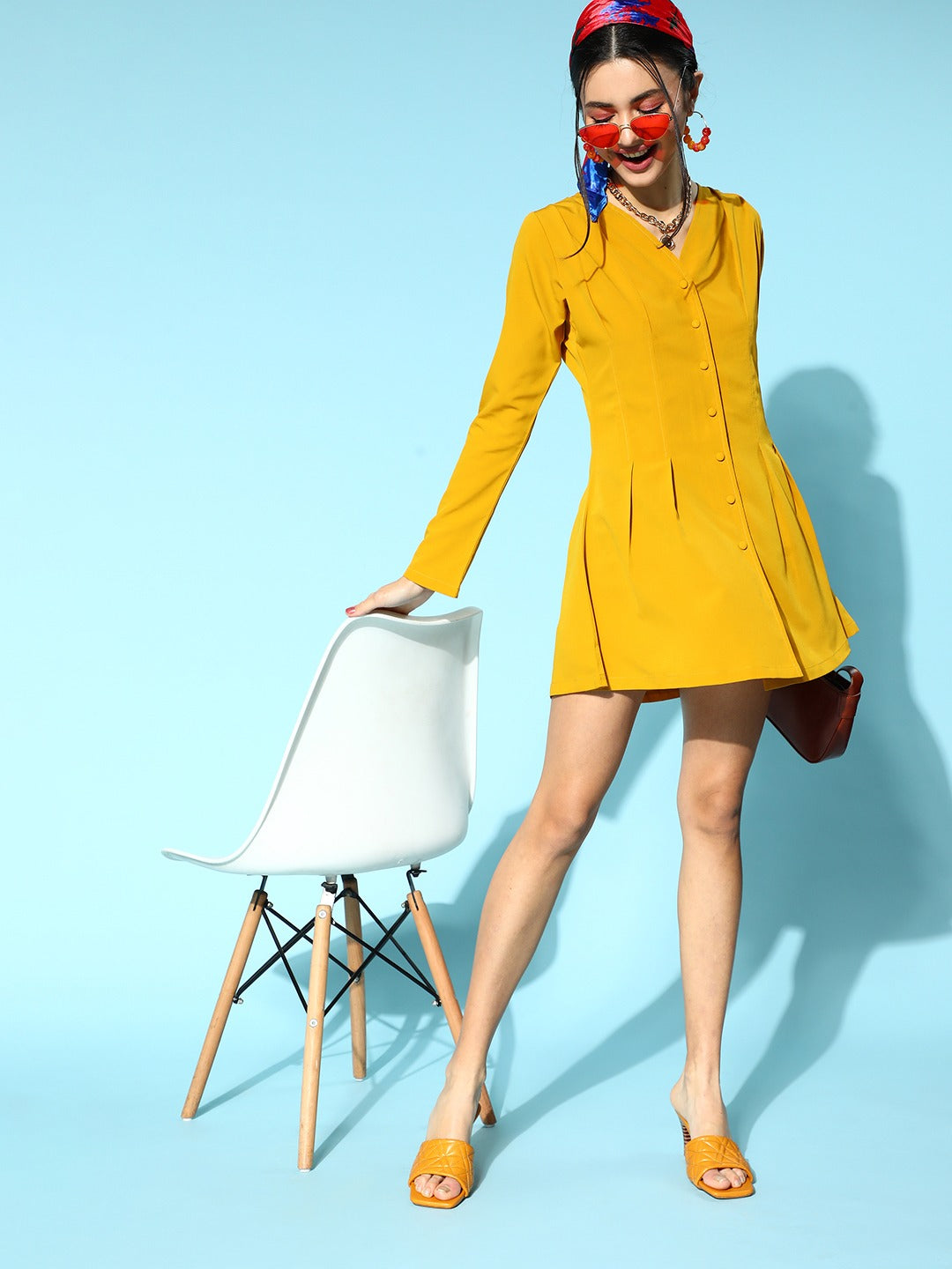 Berrylush Women Solid Mustard Yellow V-Neck Front Button Crepe Pleated Mini Shirt Dress