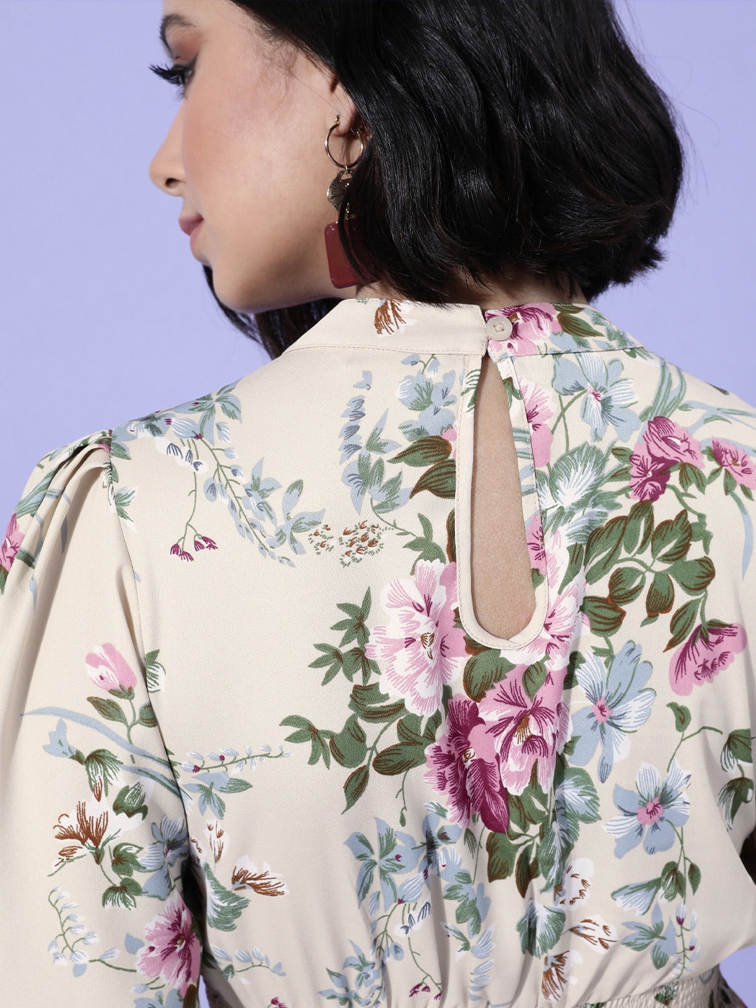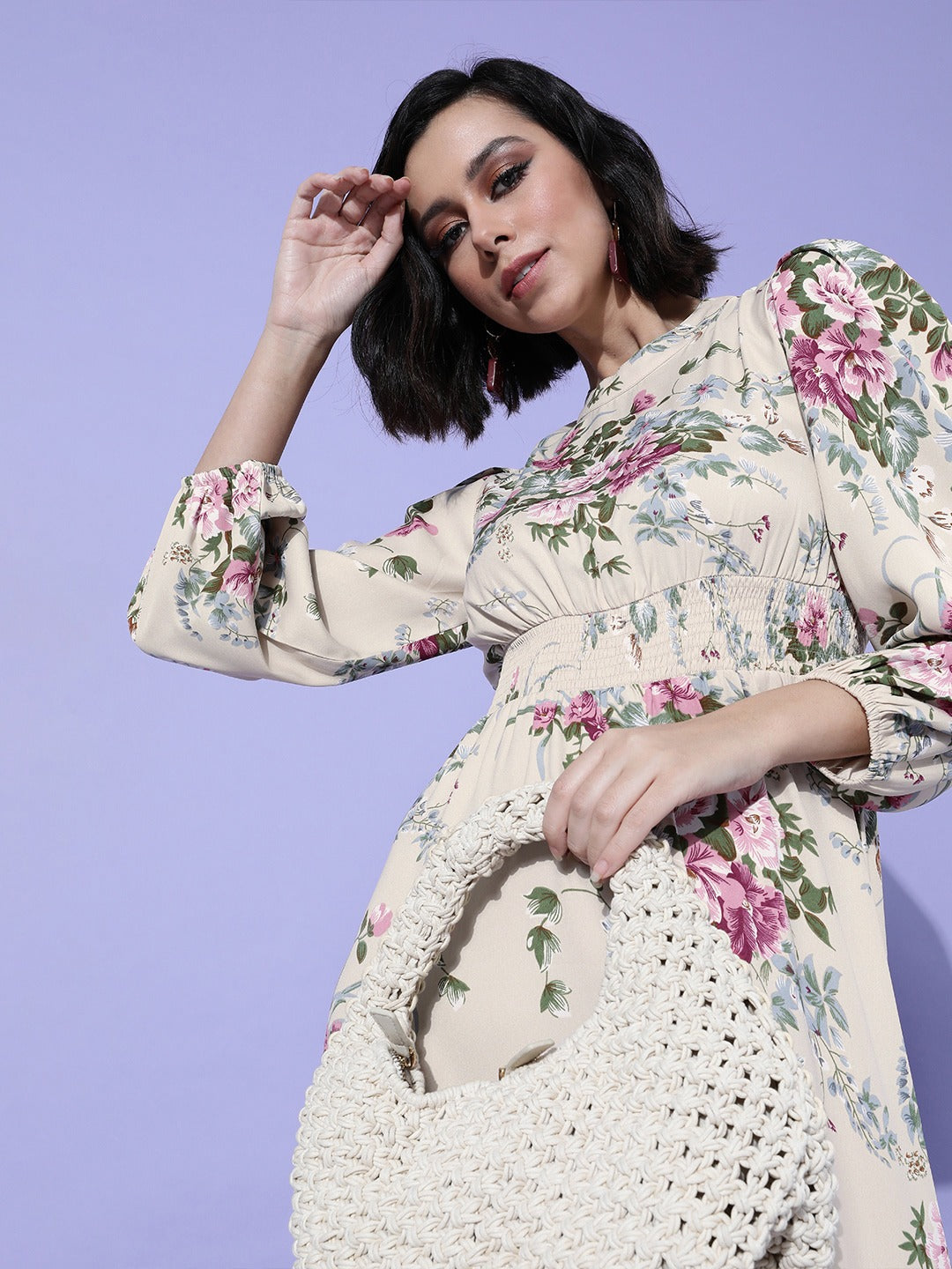 • Beige colour with floral print assembles a delicate and cinematic appeal