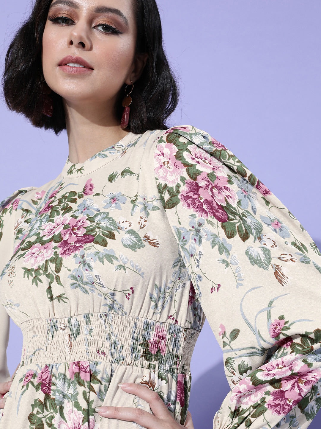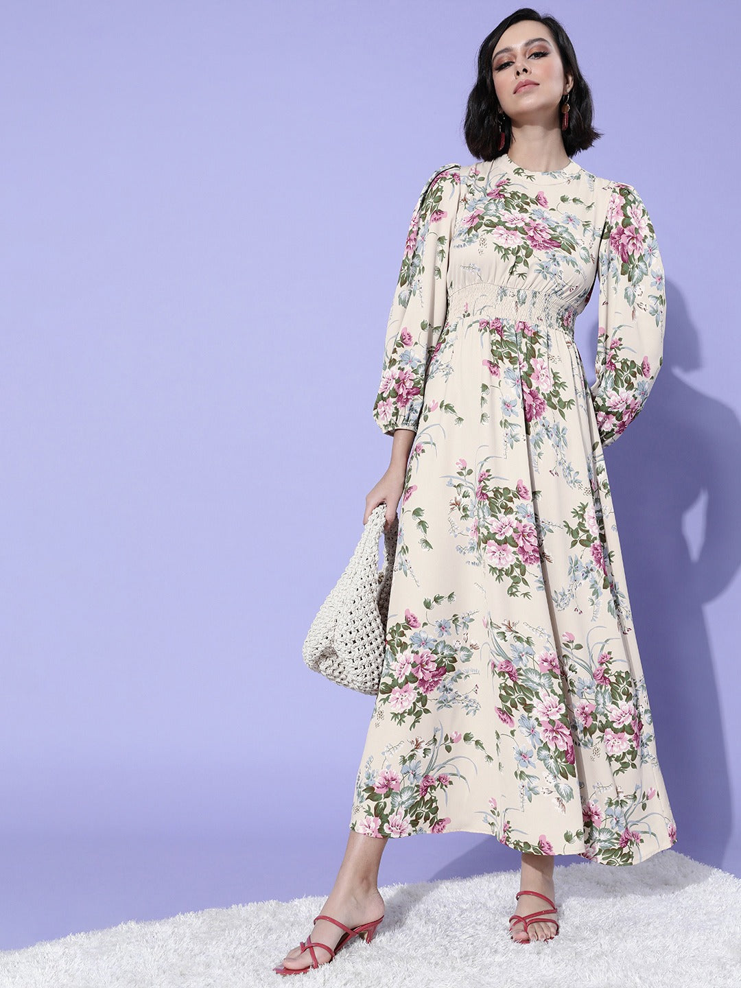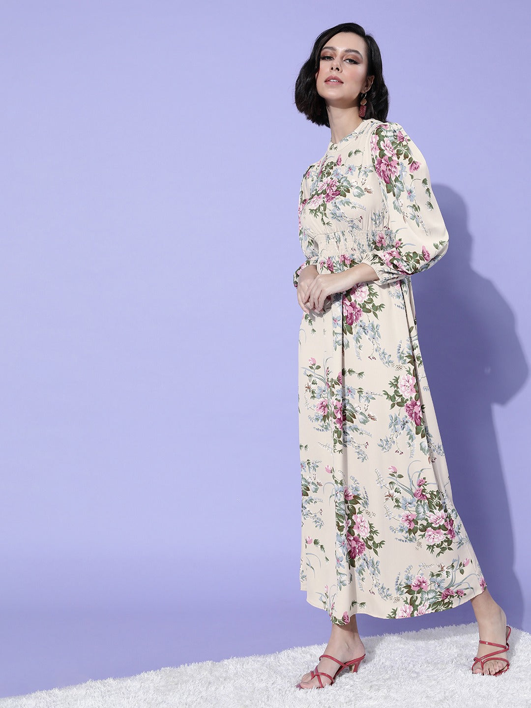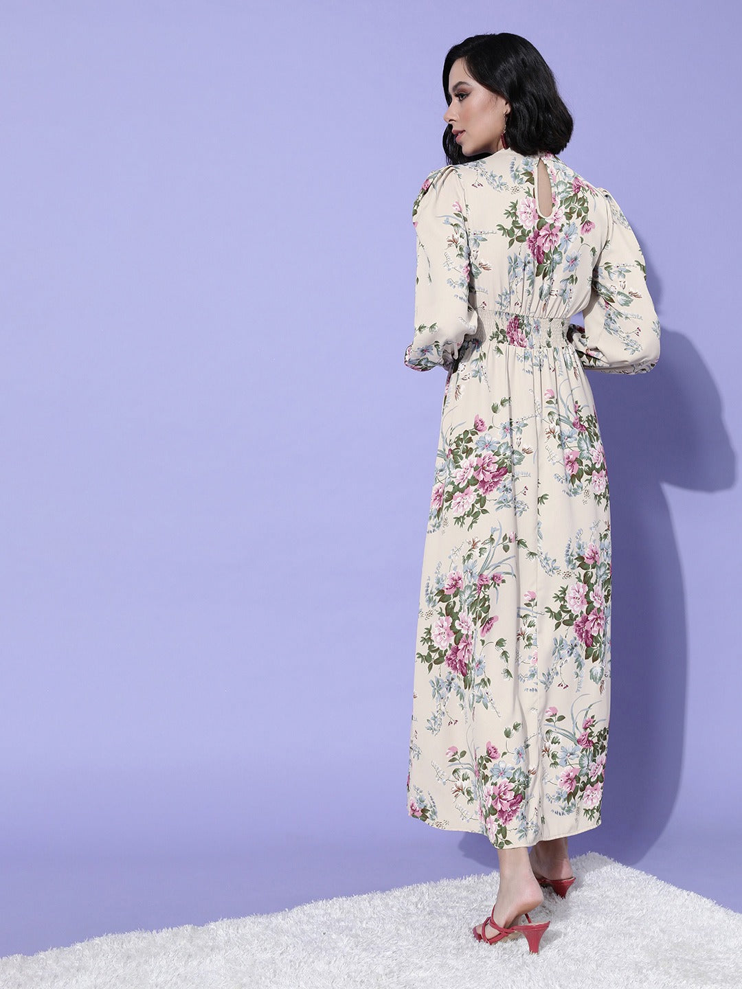 Berrylush Women Beige Floral Printed Mock-Neck Crepe Maxi Dress