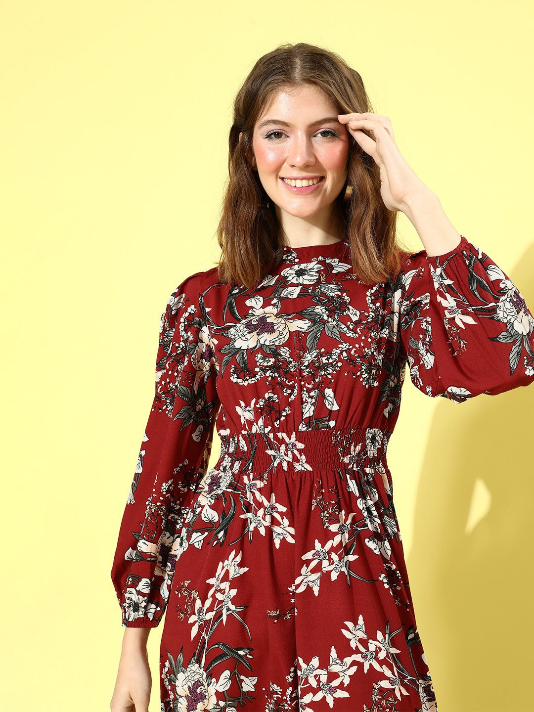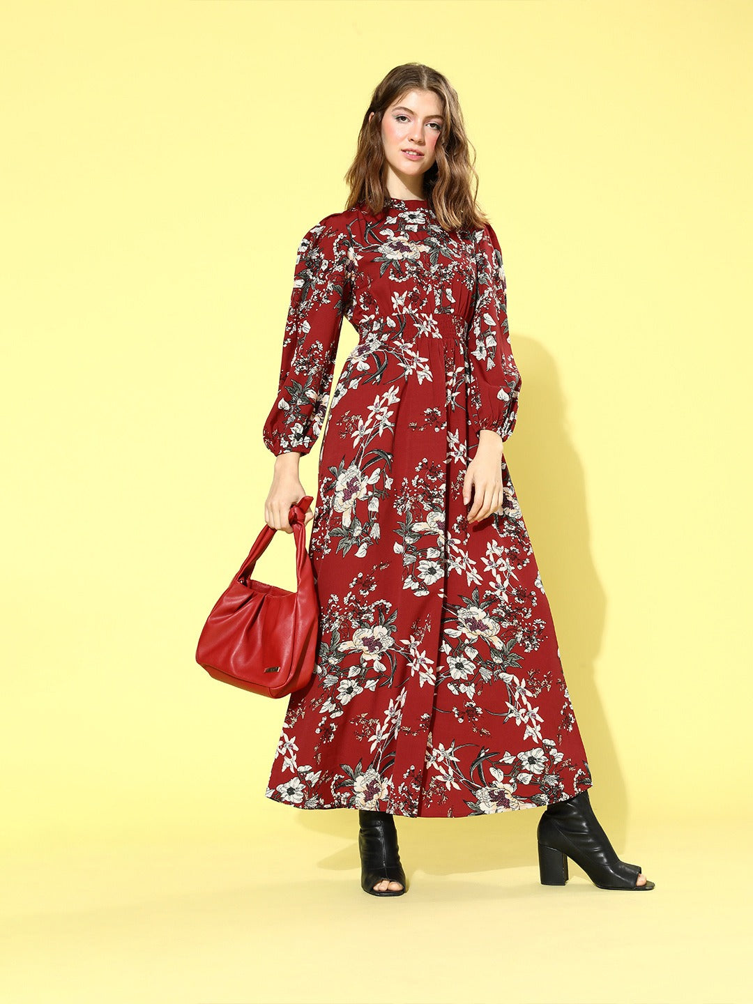 Get the natural blush by decorating your casual outing with this Maroon Floral Printed Mock Neck A-Line Maxi Dress from Berrylush. The long bishop sleeves add a chic flair to your overall look and with the maxi length of the dress, your overall height attains a hype naturally. The A-line skirt helps retain the shape of your body proportion brilliantly. Features smocked detailing at the waistline, your aura gets another level of elegance. The captivating allover floral design of the maxi dress flatters your entire appearance with its alive styling element. Style this flowery rousing maxi dress with strappy heels and become the sensational model of the casual look by Berrylush.
