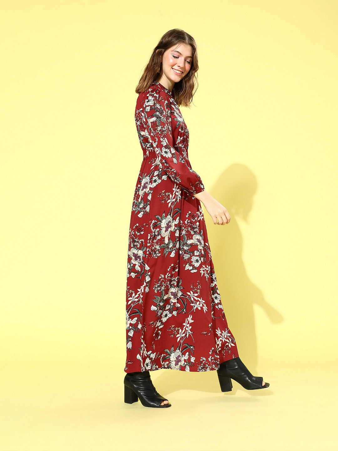Berrylush Women Maroon Floral Printed Mock Neck A-Line Maxi Dress