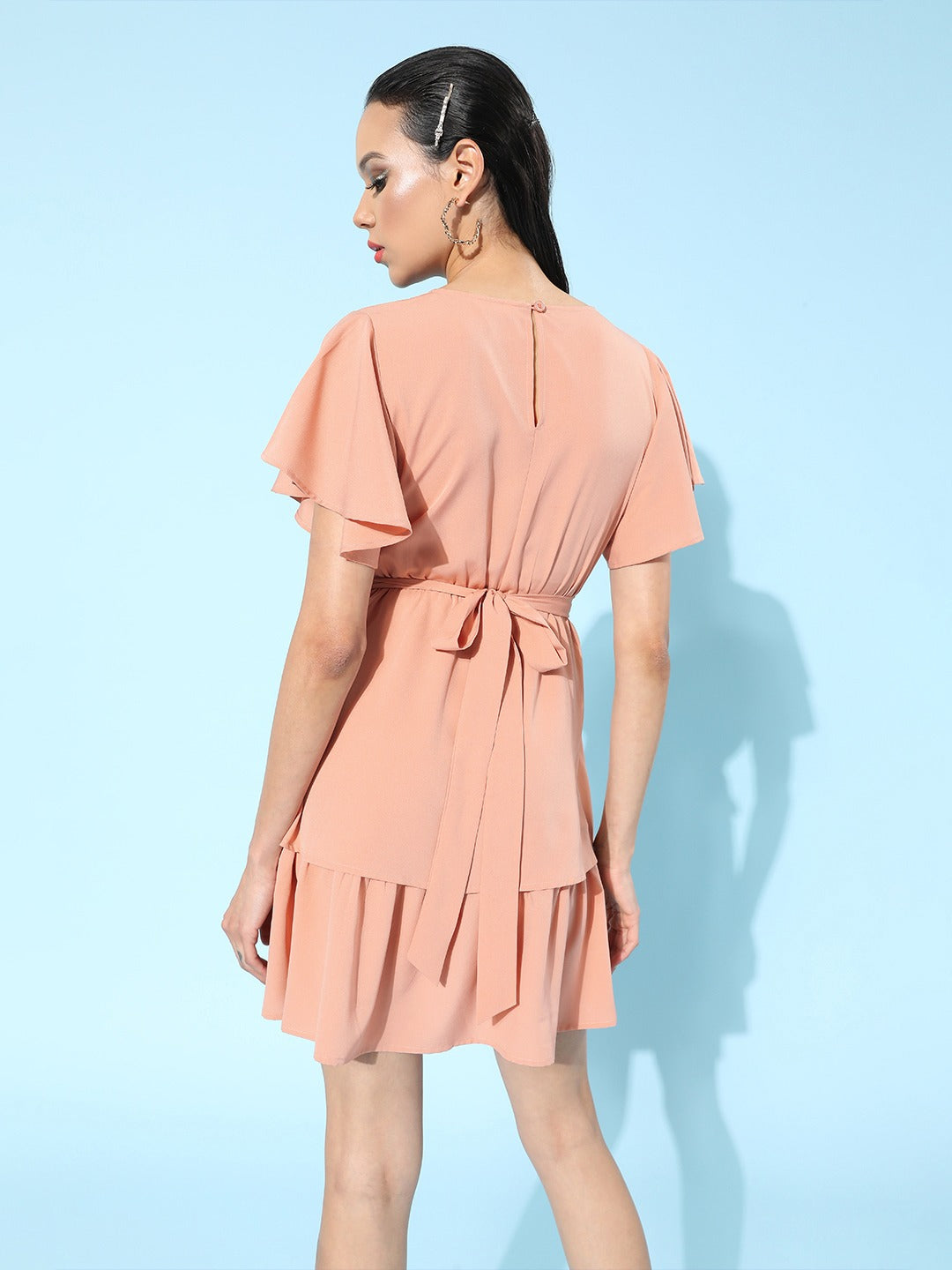 Berrylush Women Solid Pink V-Neck Waist Tie-Up Flounce Ruffled A-Line Mini Dress