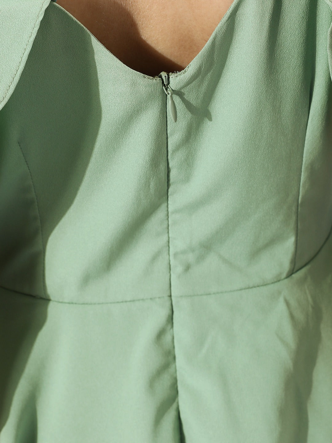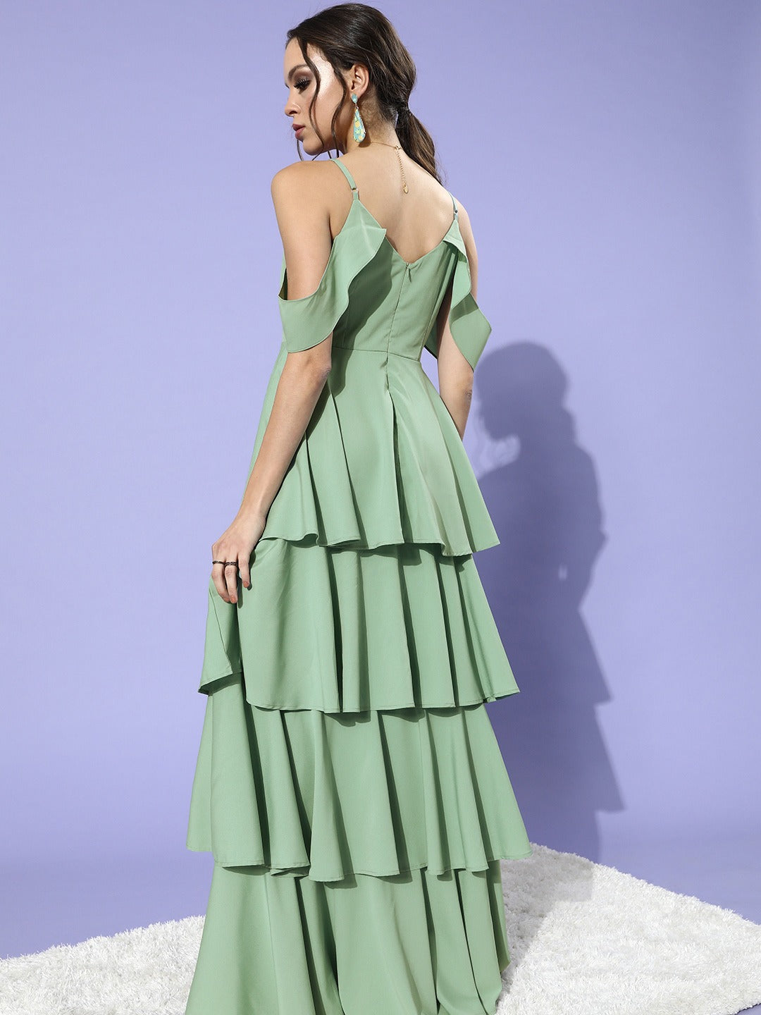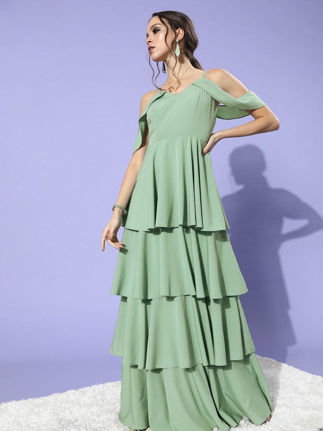 Berrylush Women Solid Green V-Neck Cold-Shoulder Flounce Hem Layered A-Line Maxi Dress