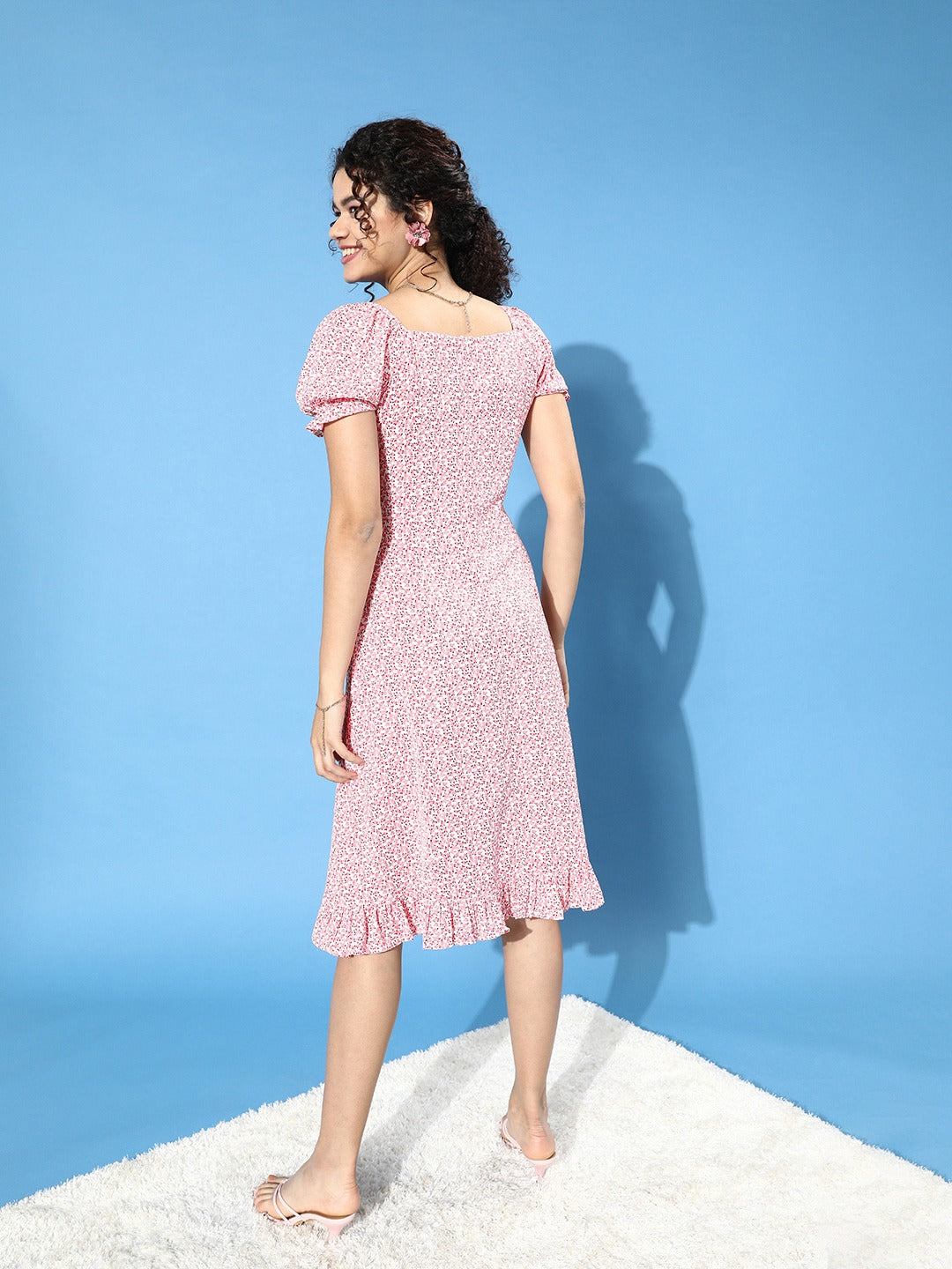 Berrylush Women Pink Floral Printed Crepe Ruffled A-Line Midi Dress