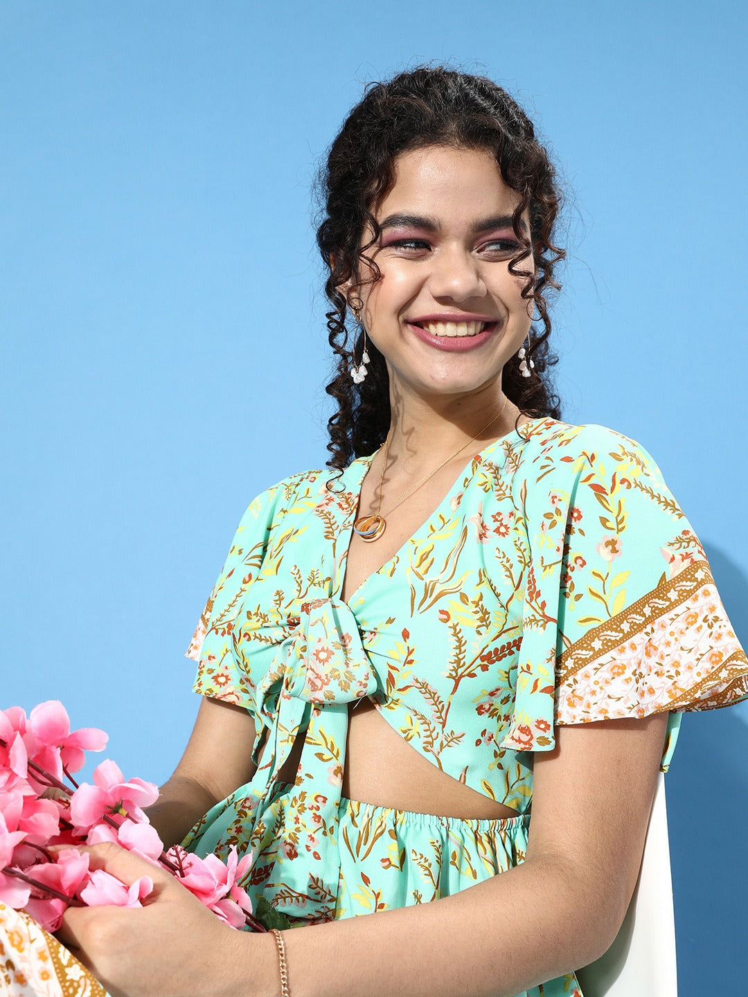Incorporate a classic and charming elegance into an outdoor outfit this season by opting for this chic Green Tribal Printed V-Neck Crepe A-Line Mini Dress from Berrylush. The green tribal print gets you contemporary and vibrant addition to your casual look. A-line shape of the dress gives you a flattering outlook while the short bell sleeves get your arms an attractive appeal. The mini-length adjoin with flared hemline assembles an exotic vibe with a luxurious sheen to your appearance. The tie-ups surface provides you with the desired fit and enables you to catch up with the bohemian main trend. Crepe polyester fabric offers stain resistance with anti-shrinking properties. Pair up this mesmerizing mini dress with high-heels and an adorable clutch to obtain a fashionable and dazzling outlook.