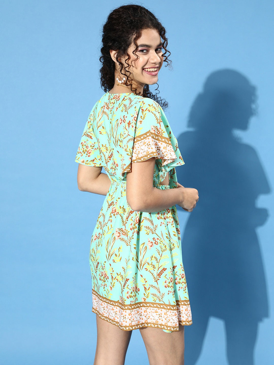 Berrylush Women Green Tribal Printed V-Neck Crepe A-Line Mini Dress