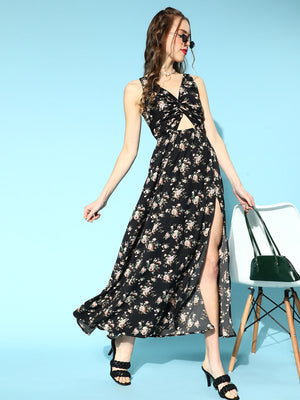Berrylush Women Black & Pink Floral Printed V-Neck Open Back Thigh-High Slited A-Line Maxi Dress
