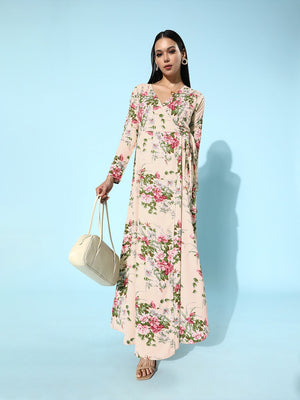 Berrylush Women Beige Floral Printed V-Neck Wrap Style Maxi Dress