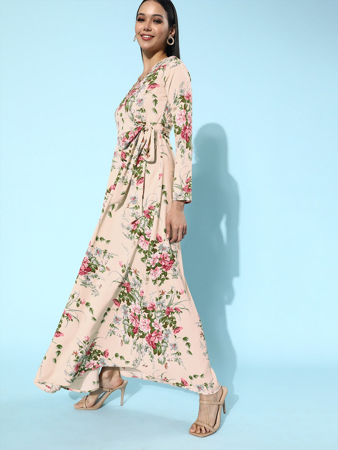 Inject a bewitching and free-spirited feel to your urban wear closet with this beautiful Beige Floral Printed V-Neck Wrap Style Maxi Dress from the floral print collection of Berrylush. Punctuated from a lightweight crepe polyester fabric to give moisture-wicking property and an amazing drape. The wrap style of the maxi dress state out a unique and fashion-flaunting casual look and the tie-up detail gets you a curve-hugging silhouette. Designed with long and regular sleeves to offer constraint-free actions to your arms with a smooth sheen while the maxi length adjoins with flared hem add a decorative texture to your overall look. Team up this cinematic maxi dress with a pair of strappy heels and a lean handbag to add a feminine charm to your casual outlook.