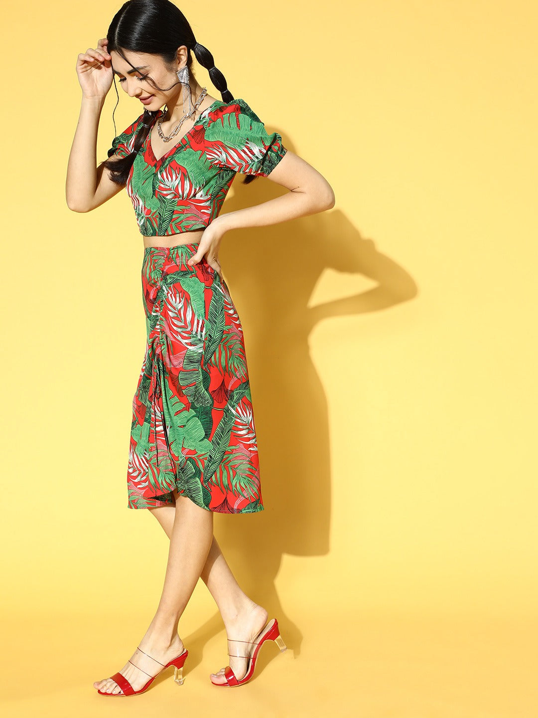 Berrylush Women Red & Green Tropical Printed Sweetheart Neck Front Tie-Up Straight Hem Ruched Midi Co-Ordinated Set